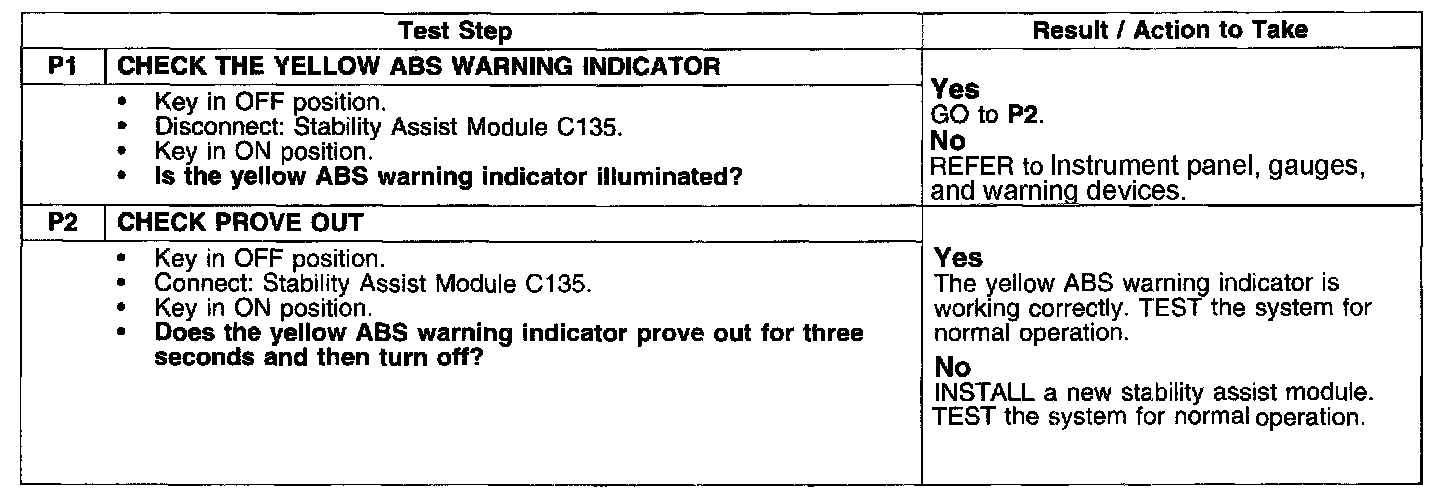 PINPOINT TEST P: THE YELLOW ABS WARNING INDICATOR DOES NOT SELF-CHECK