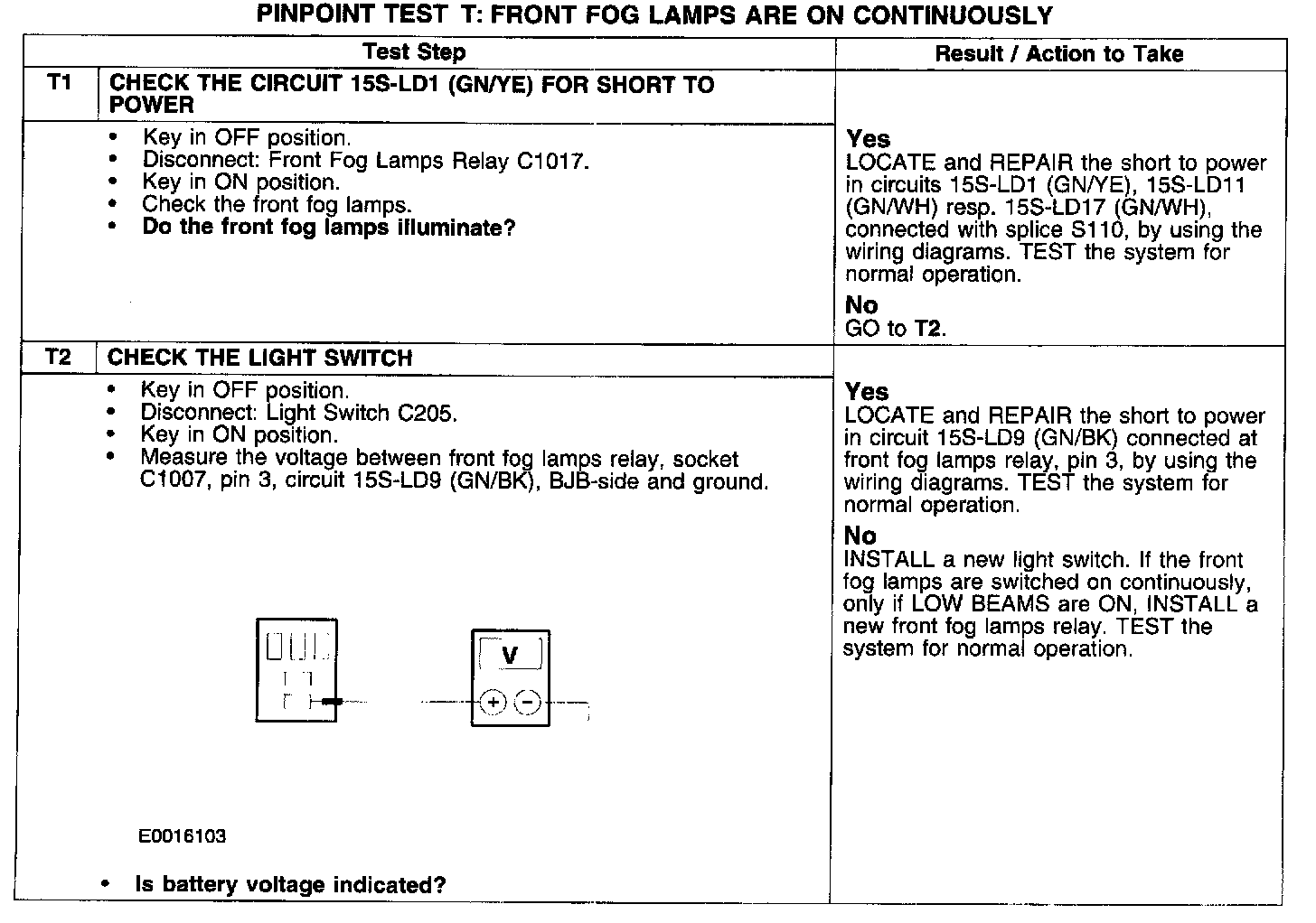 PINPOINT TEST T: FRONT FOG LAMPS ARE ON CONTINUOUSLY