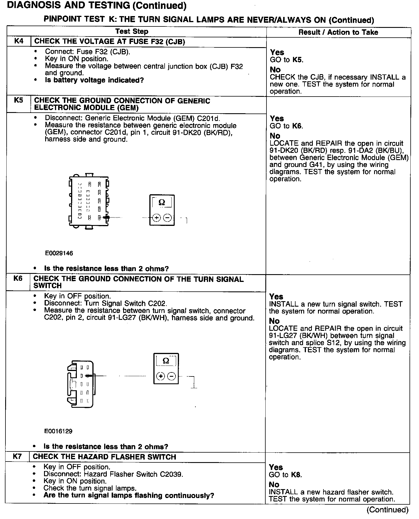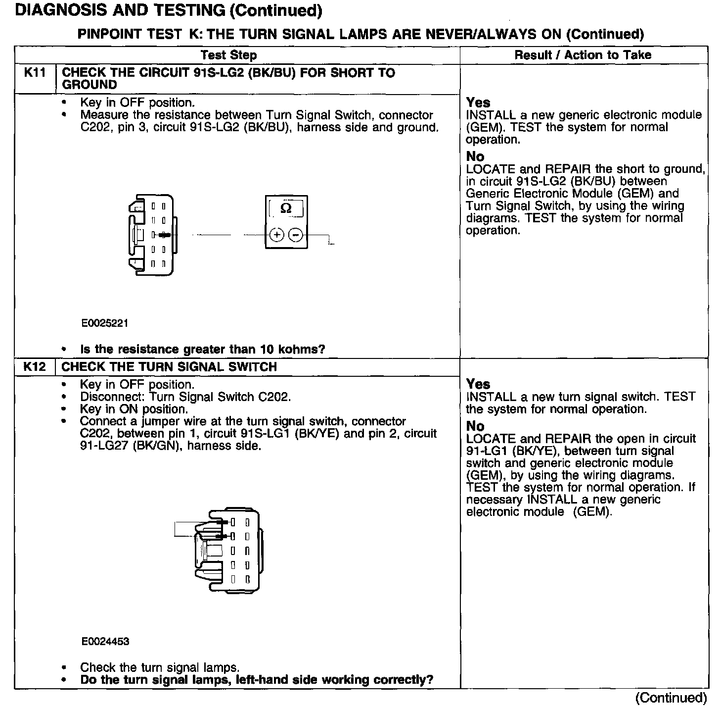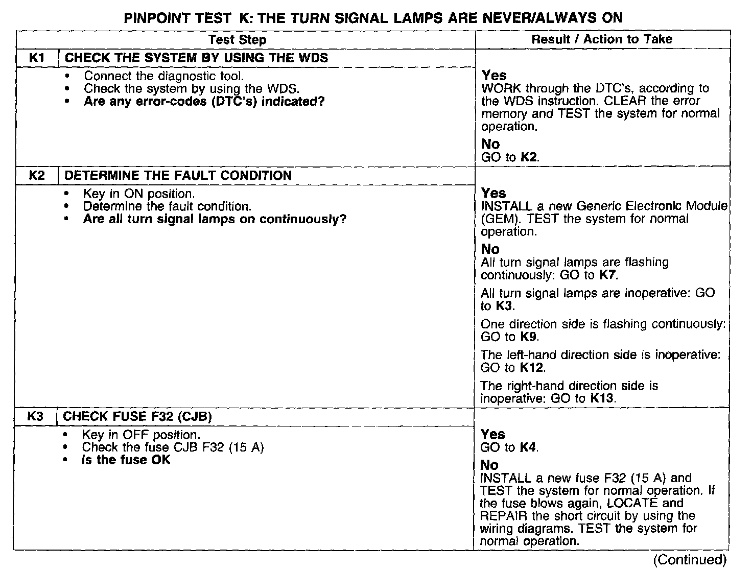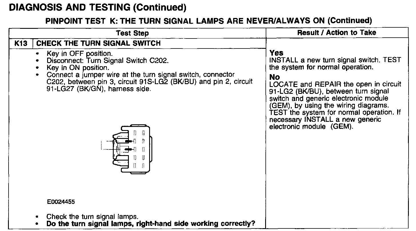 PINPOINT TEST K: THE TURN SIGNAL LAMPS ARE NEVER/ALWAYS ON
