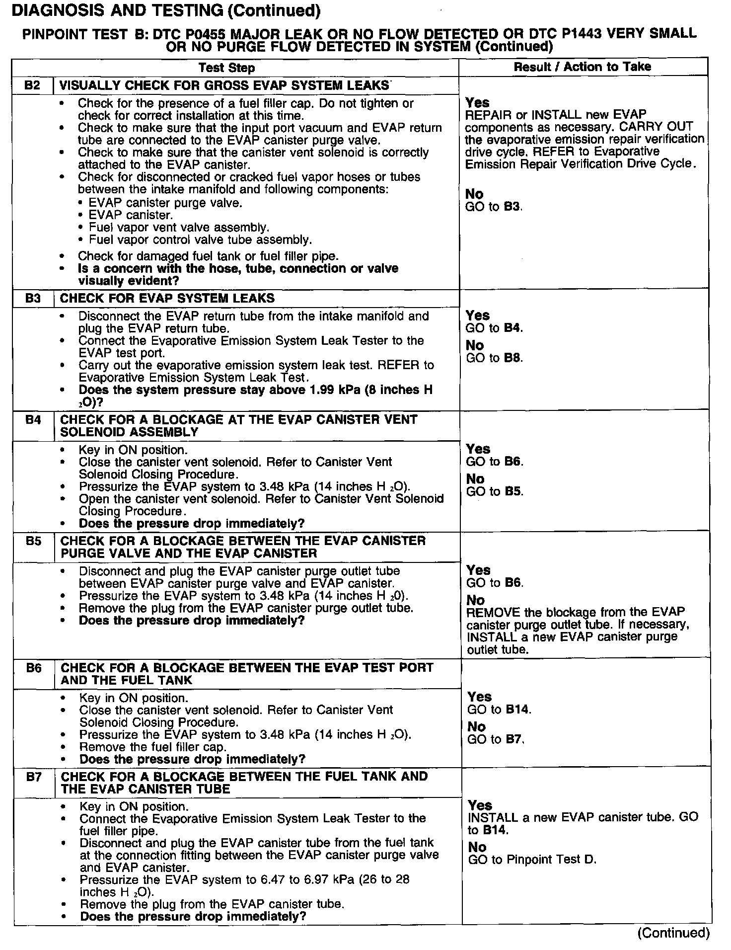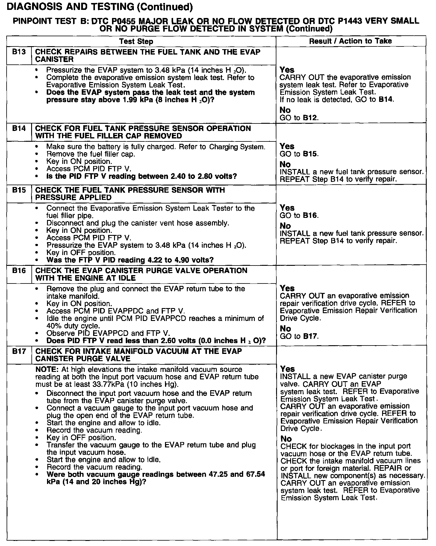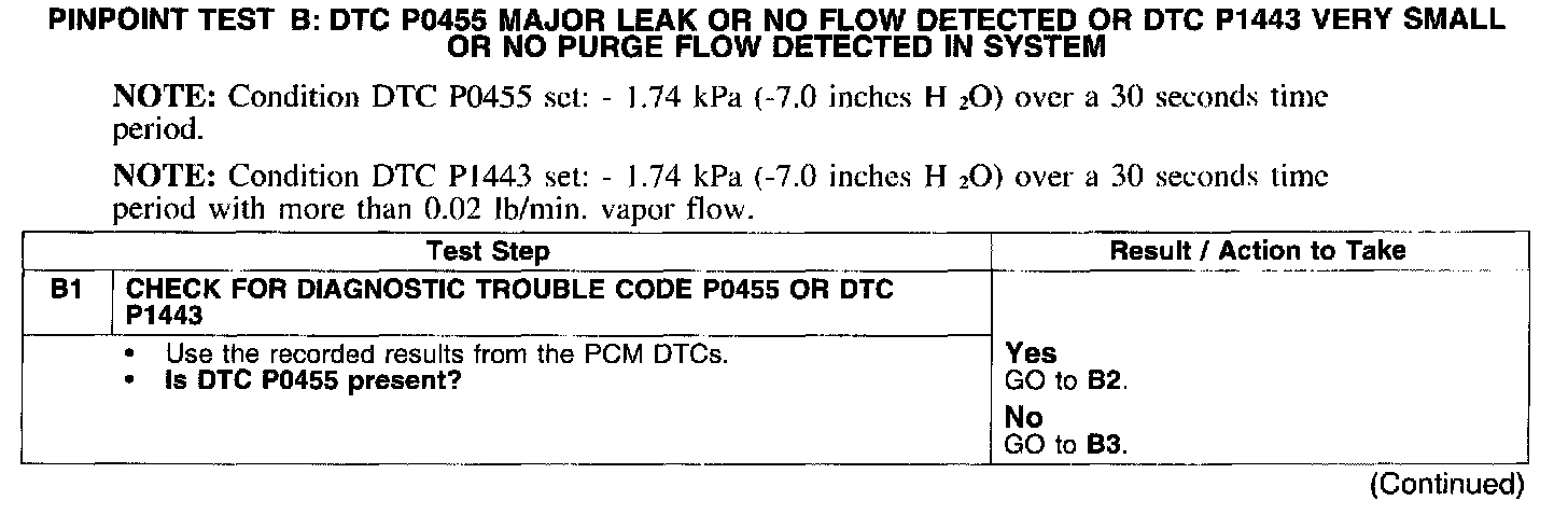 PINPOINT TEST B: DTC P0455 MAJOR LEAK OR NO FLOW DETECTED OR DTC P1443 VERY SMALL OR NO PURGE FLOW DETECTED IN SYSTEM