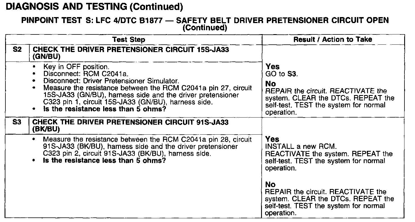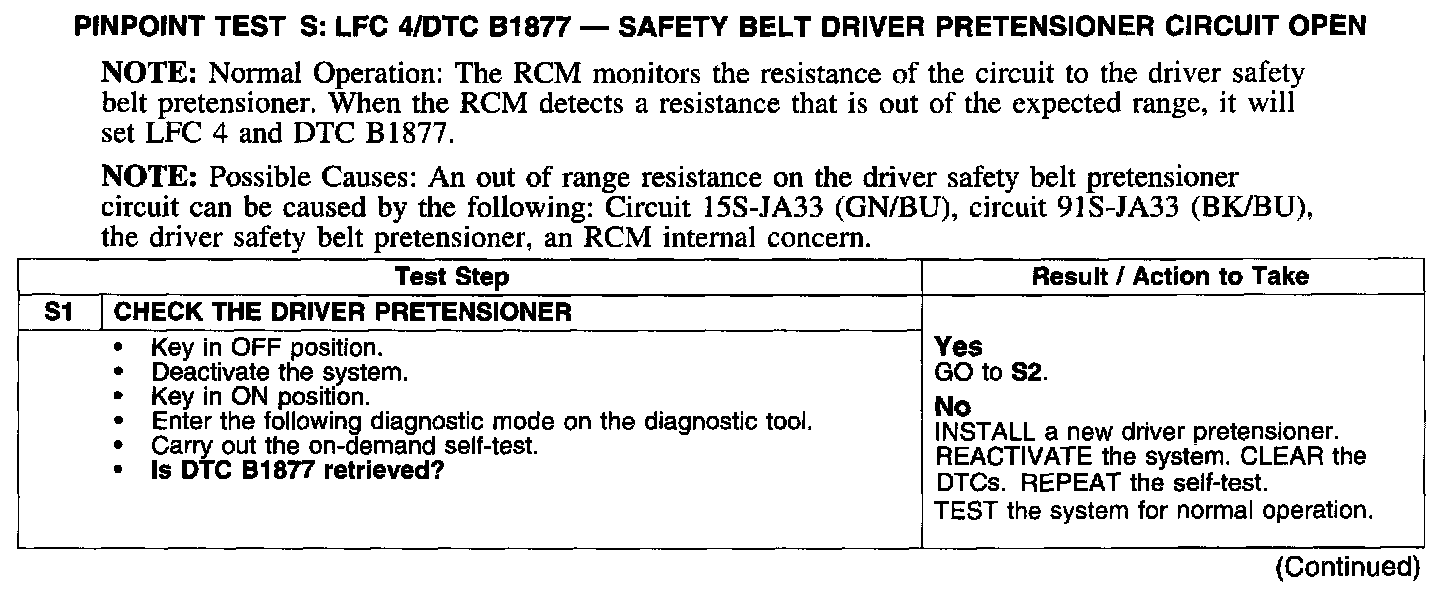 PINPOINT TEST S: LFC 4/DTC B1877 - SAFETY BELT DRIVER PRETENSIONER CIRCUIT OPEN