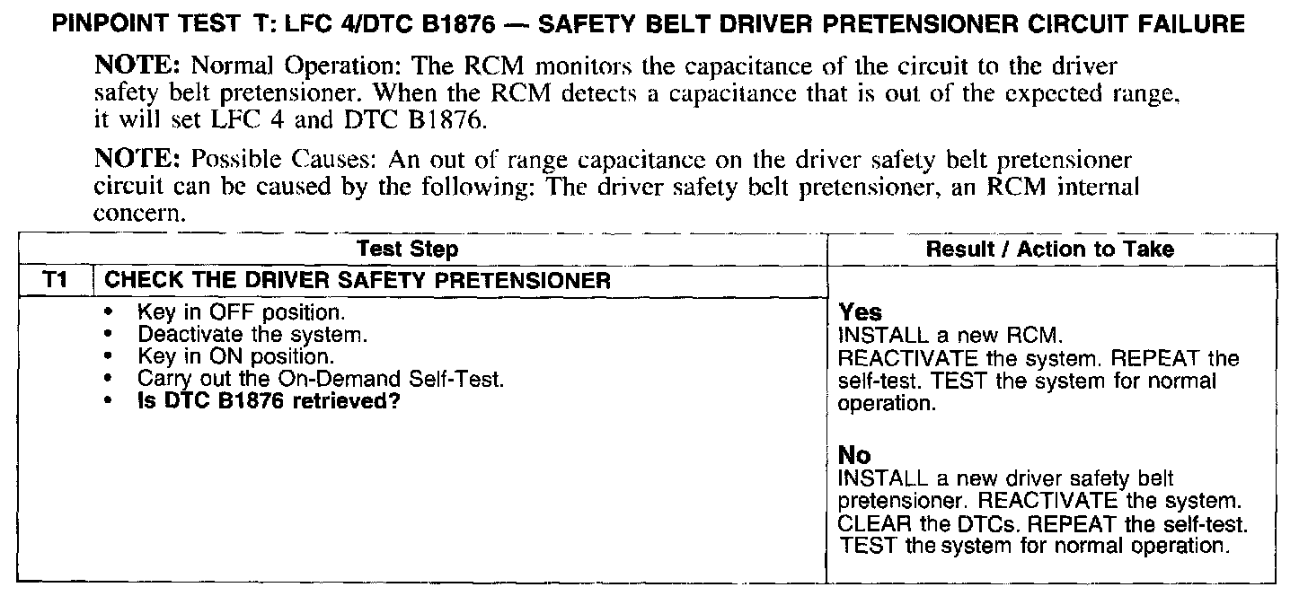 PINPOINT TEST T: LFC 4/DTC B1876 - SAFETY BELT DRIVER PRETENSIONER CIRCUIT FAILURE