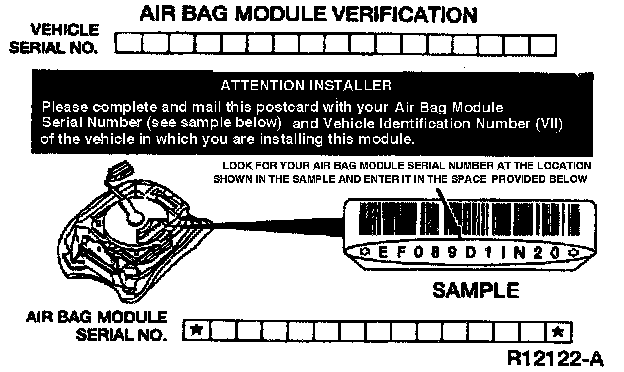 ^ A prepaid, return postcard is provided with the new air bag module. The new air bag module serial number and the Vehicle Identification Number (VIN) must be recorded on the air bag module verification card.