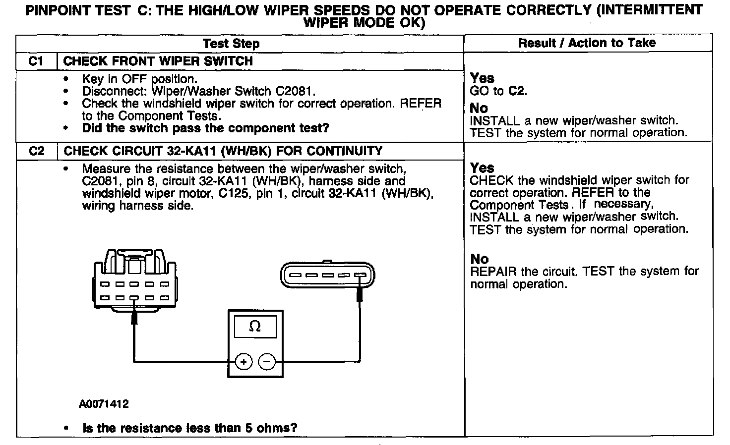 PINPOINT TEST C: THE HIGH/LOW WIPER SPEEDS DO NOT OPERATE CORRECTLY (INTERMITTENT WIPER MODE OK)