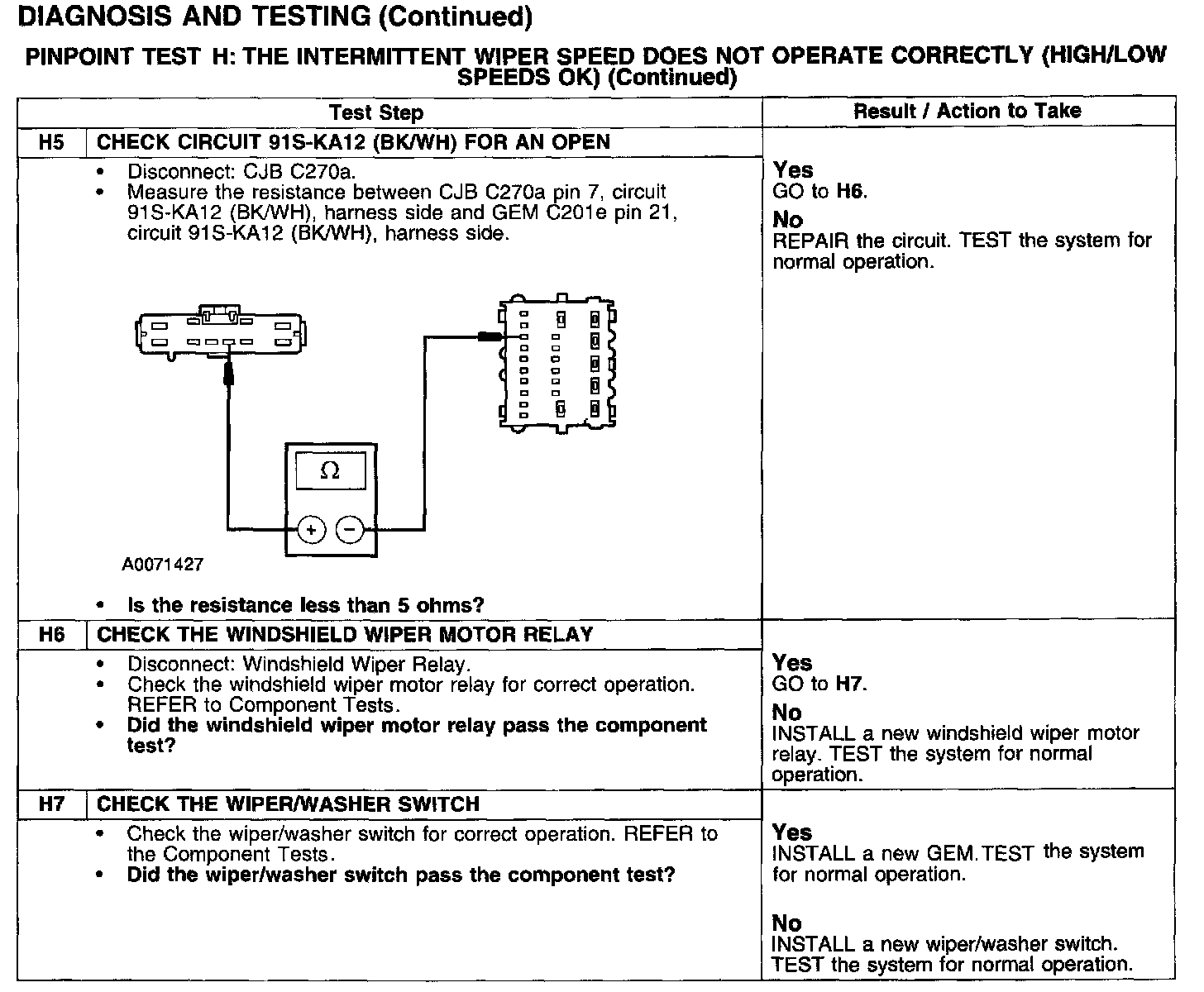 PINPOINT TEST H: THE INTERMITTENT WIPER SPEED DOES NOT OPERATE CORRECTLY (HIGH/LOW SPEEDS OK)