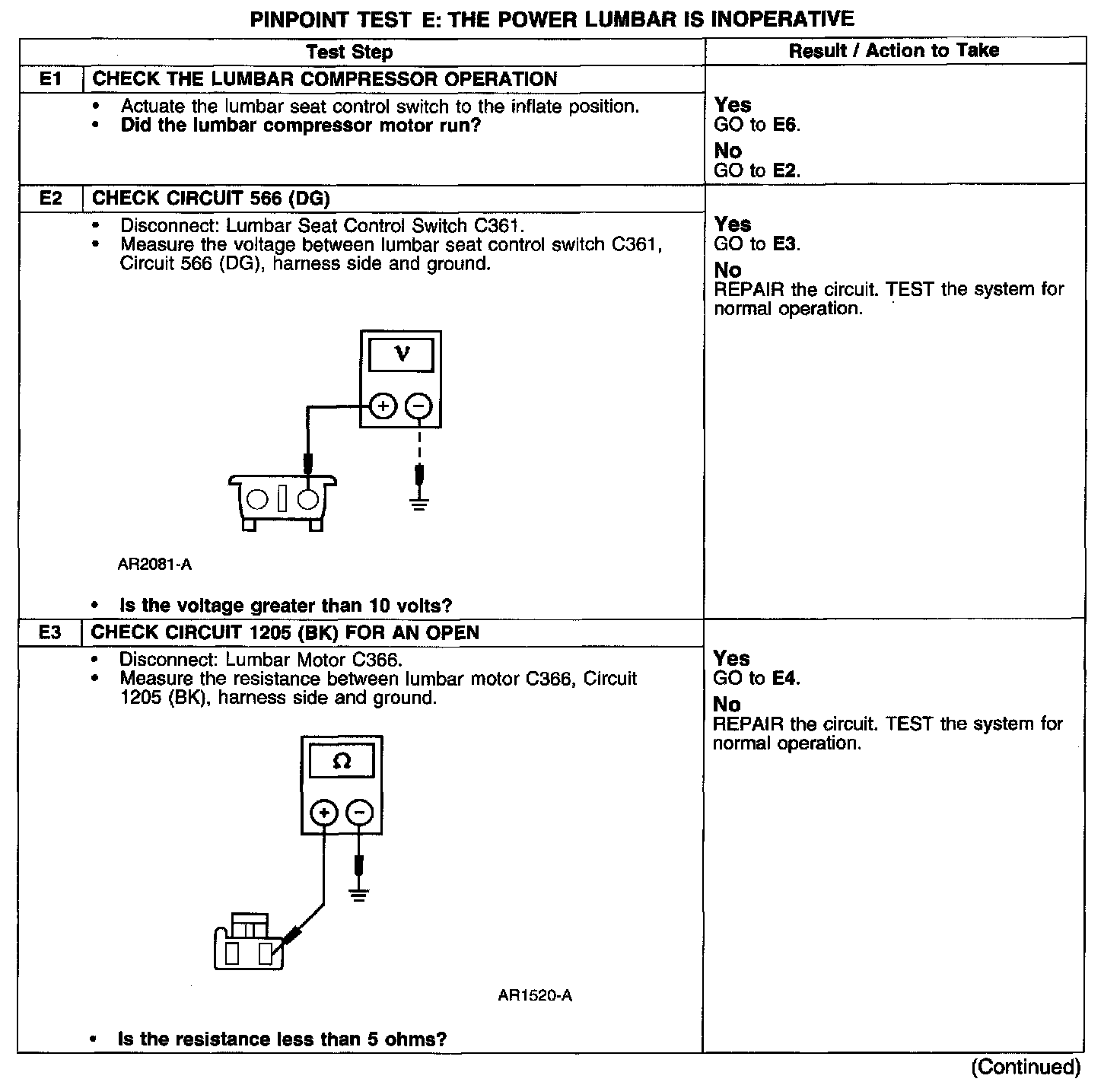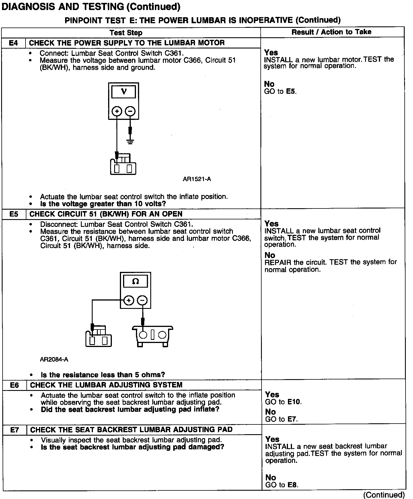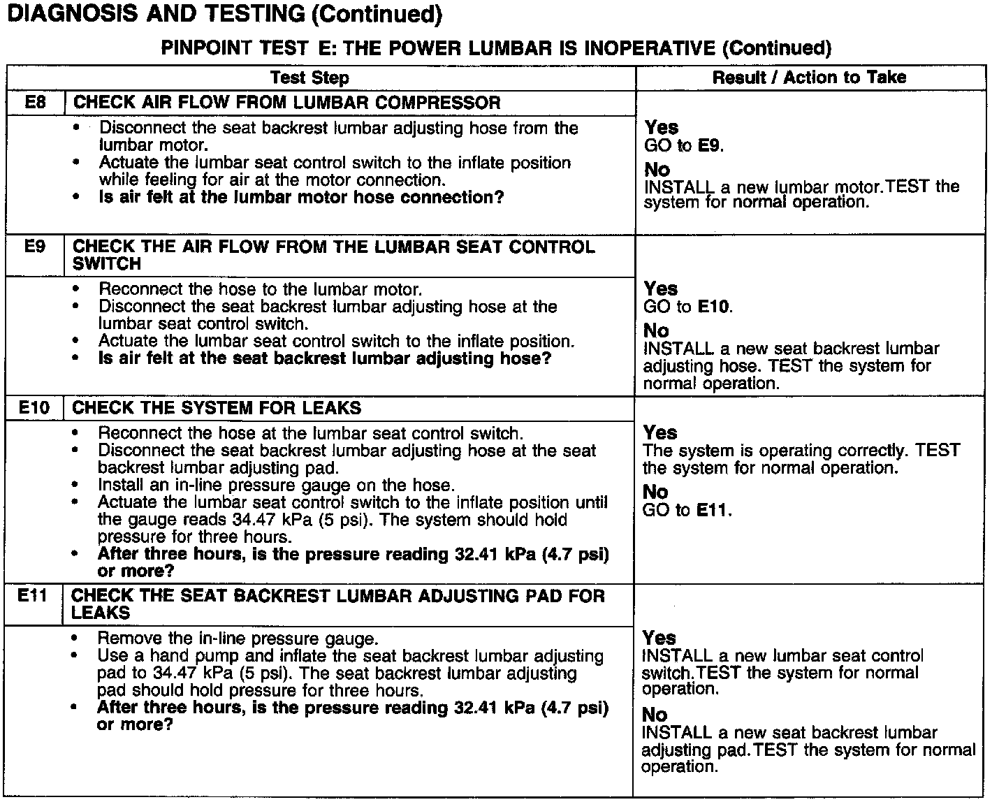 PINPOINT TEST E: THE POWER LUMBAR IS INOPERATIVE
