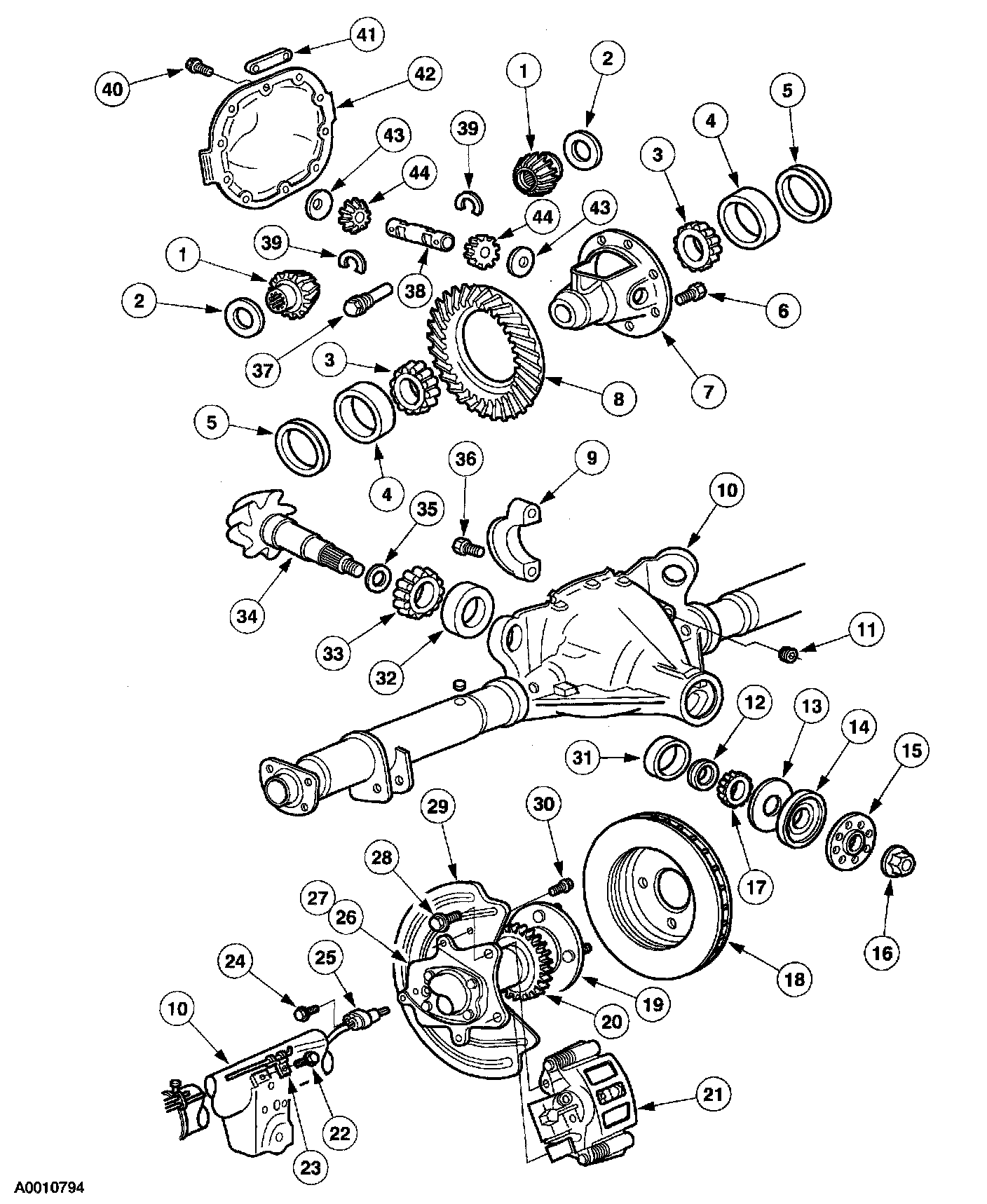 The hypoid-design gearset consists of 8.8-inch ring gear and a drive pinion gear. Two opposed tapered roller bearings support the drive pinion in the axle housing.