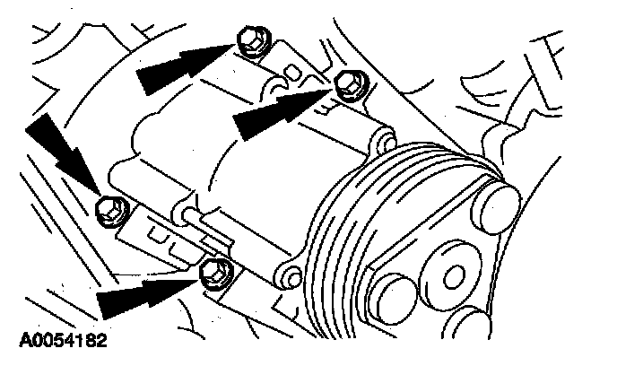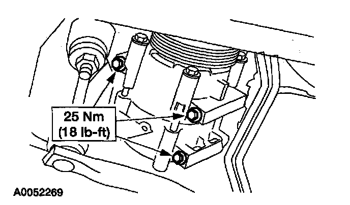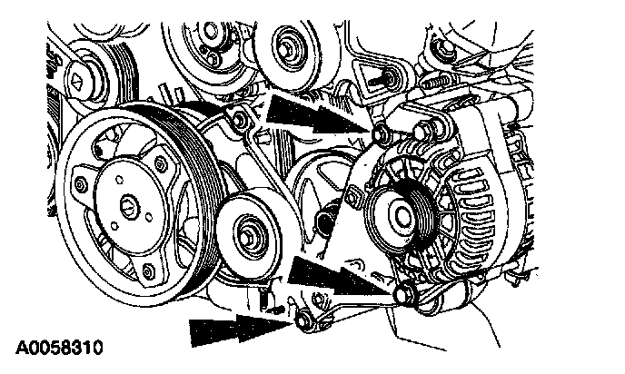 3. Remove the three bolts shown. Loosen the fourth bolt (hidden below the power steering tube) and position the power steering pump aside.