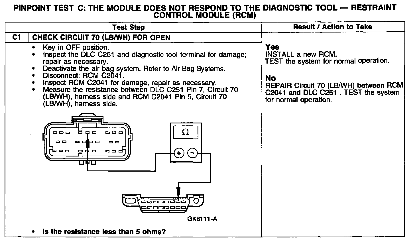 PINPOINT TEST C: THE MODULE DOES NOT RESPOND TO THE DIAGNOSTIC TOOL - RESTRAINT CONTROL MODULE (RCM)
