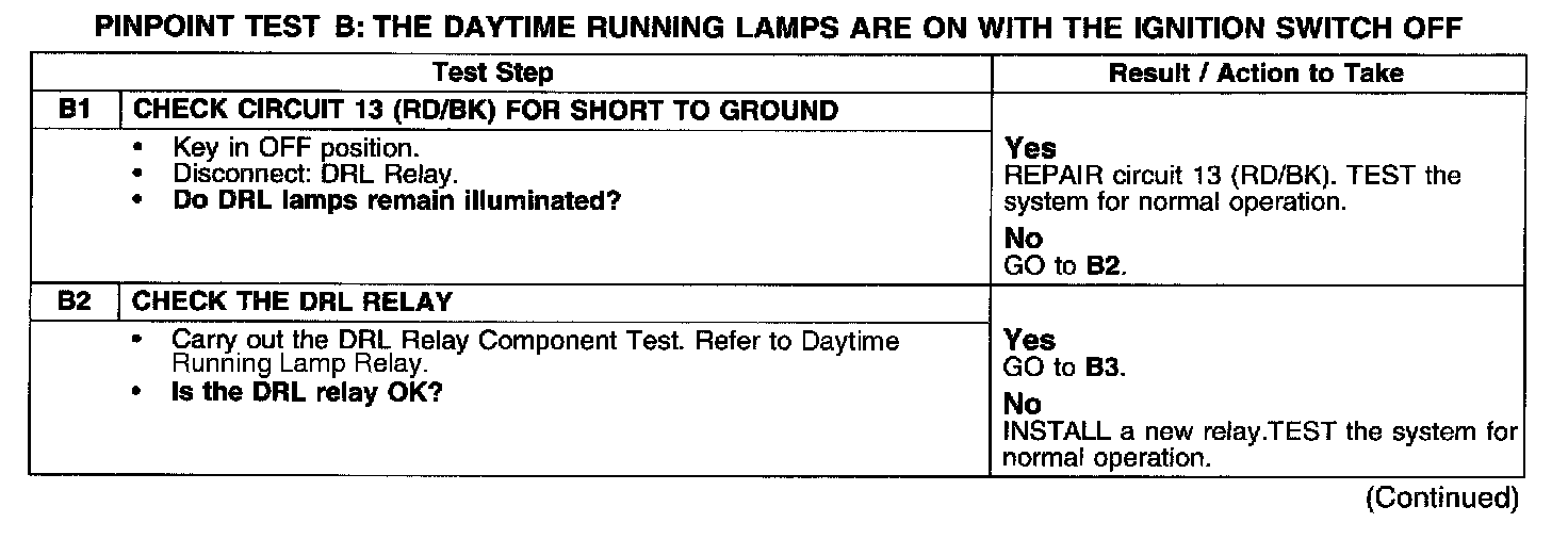 PINPOINT TEST B: THE DAYTIME RUNNING LAMPS ARE ON WITH THE IGNITION SWITCH OFF
