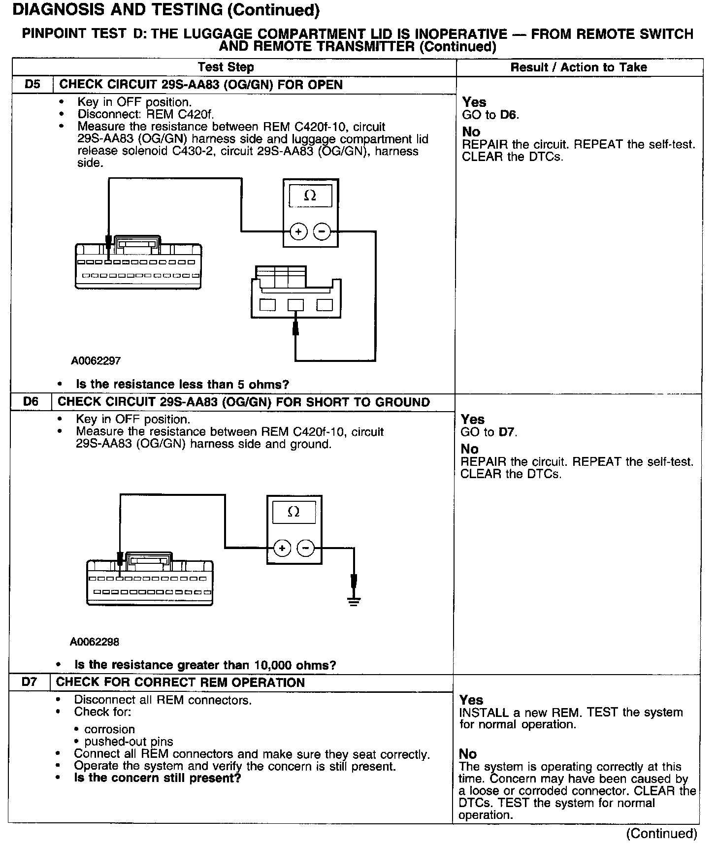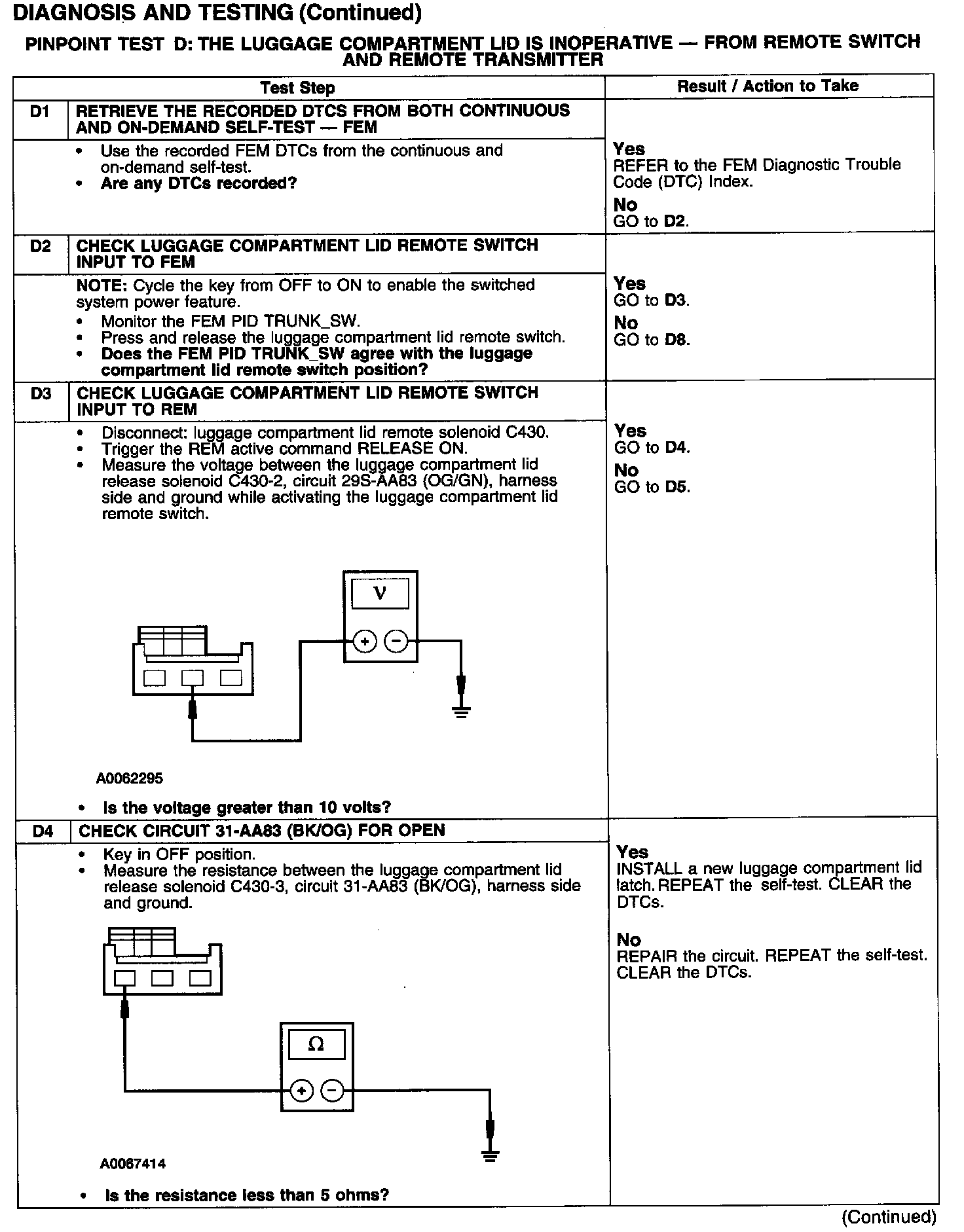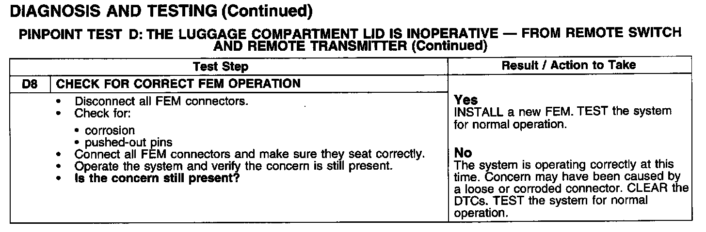 PINPOINT TEST D: THE LUGGAGE COMPARTMENT LID IS INOPERATIVE - FROM REMOTE SWITCH AND REMOTE TRANSMITTERTest D1-D4:
