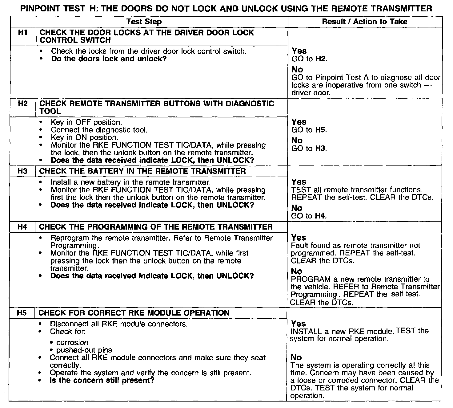 PINPOINT TEST H: THE DOORS DO NOT LOCK AND UNLOCK USING THE REMOTE TRANSMITTERTest H1-H5: