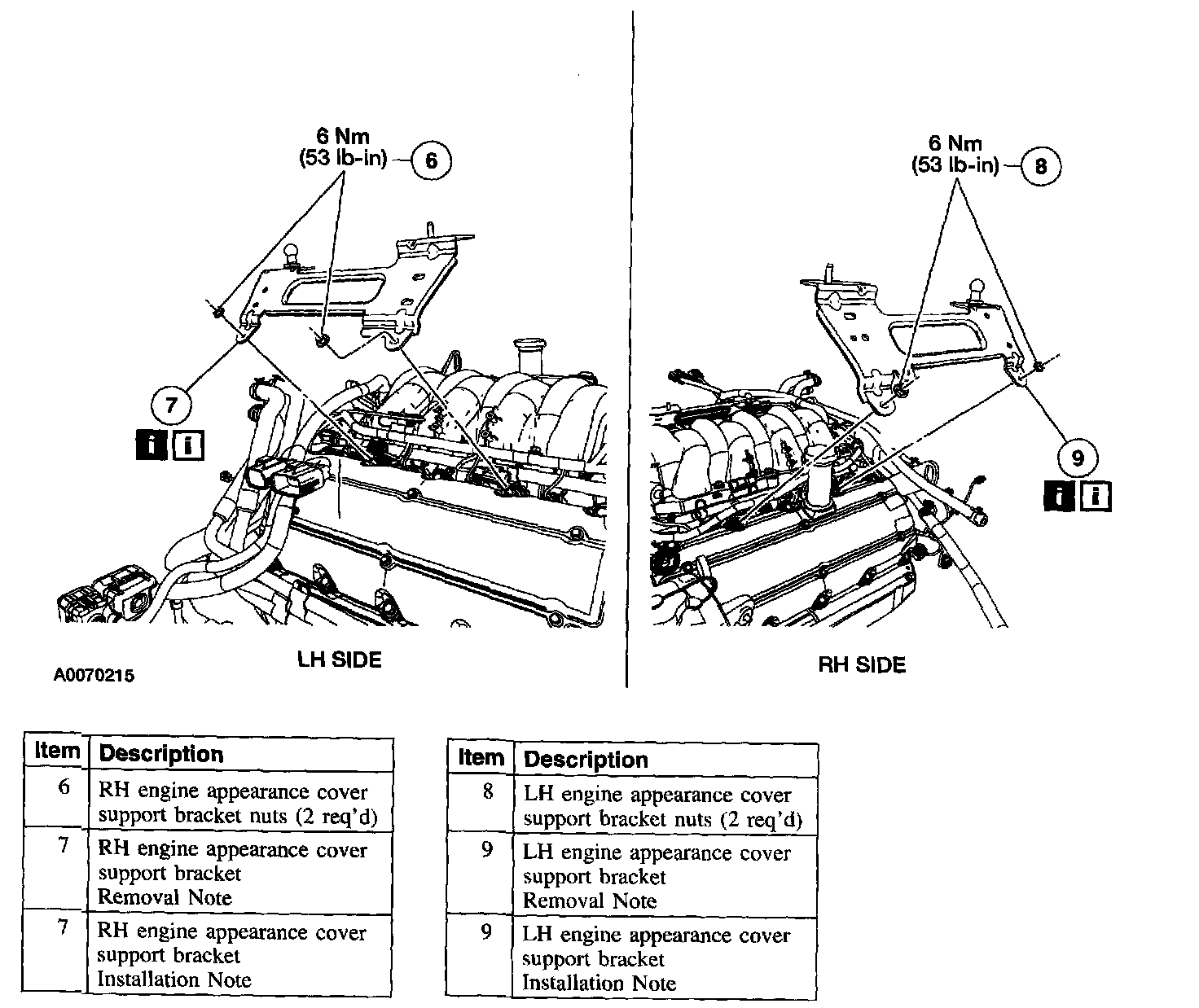 Items 7 and 9: Engine Appearance Cover Support Bracket Removal Note