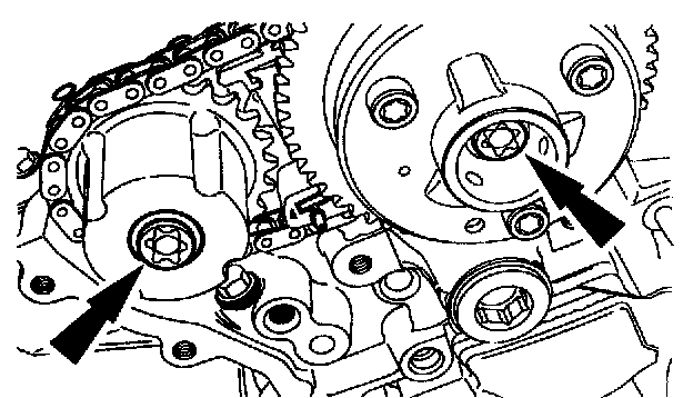 2. Using new bolls, install the LH VCT unit and exhaust camshaft sprocket bolts finger-tight.