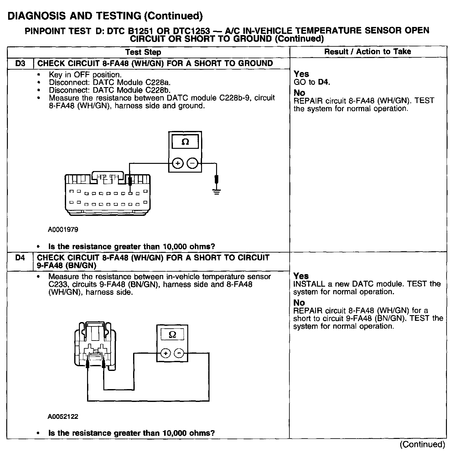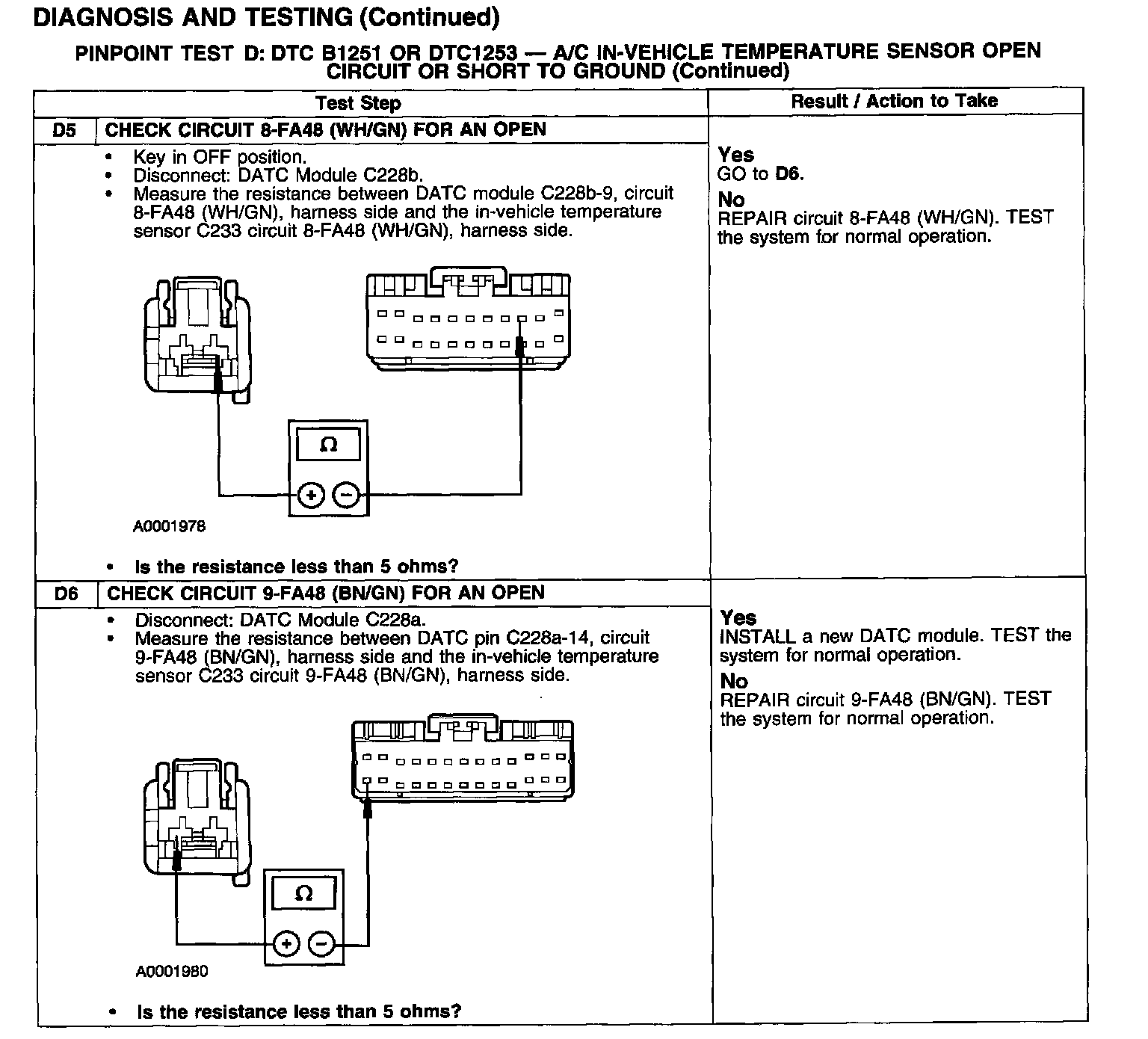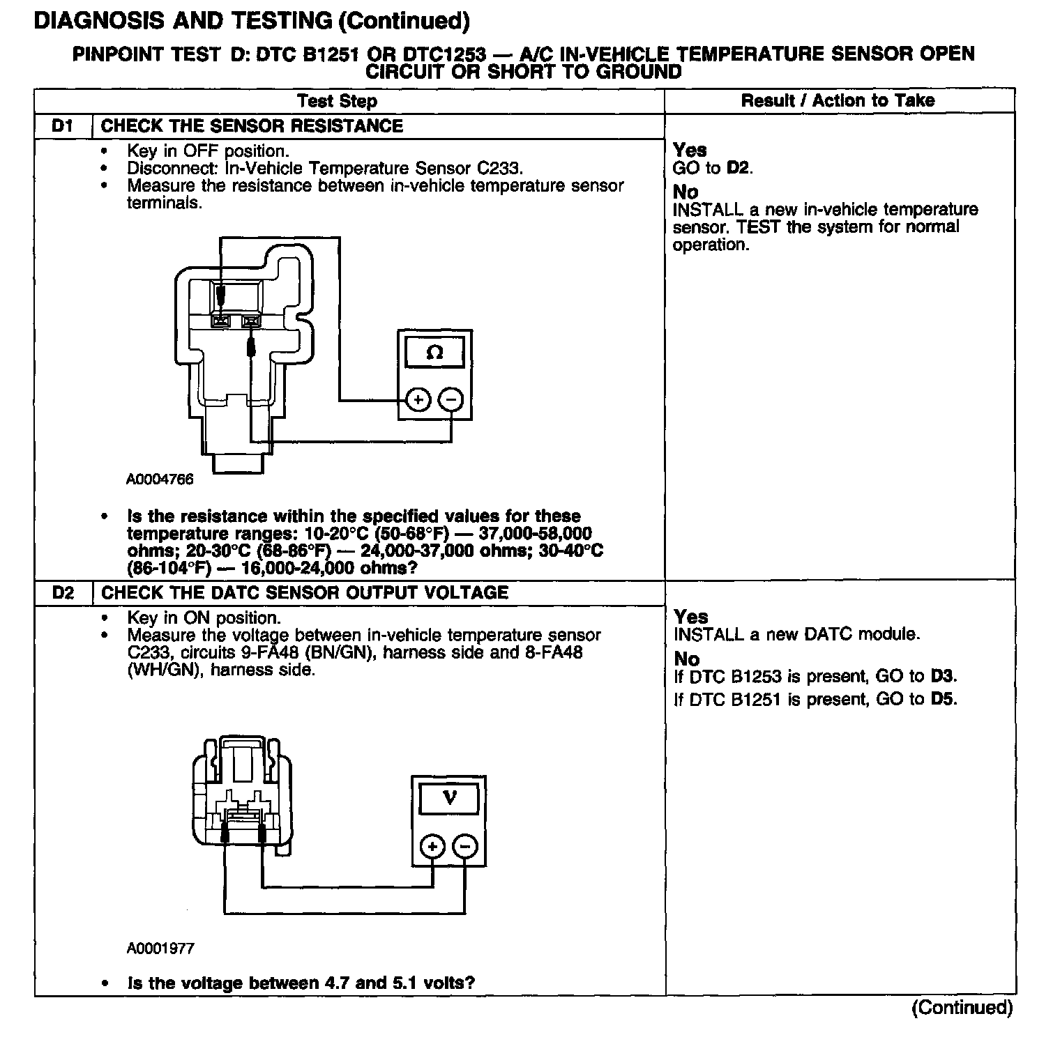 PINPOINT TEST D: DTC B1251 OR DTC 1253 - A/C IN-VEHICLE TEMPERATURE SENSOR OPEN CIRCUIT OR SHORT TO GROUNDTest D1-D2: