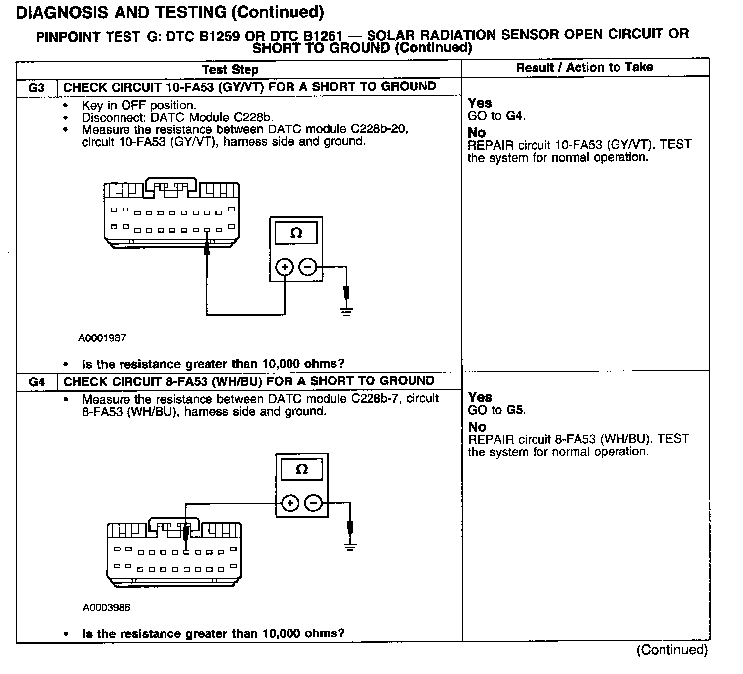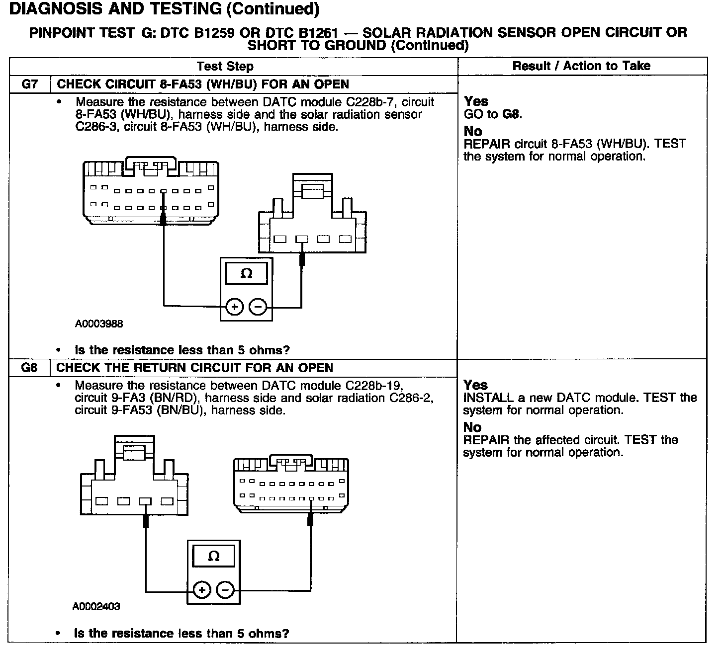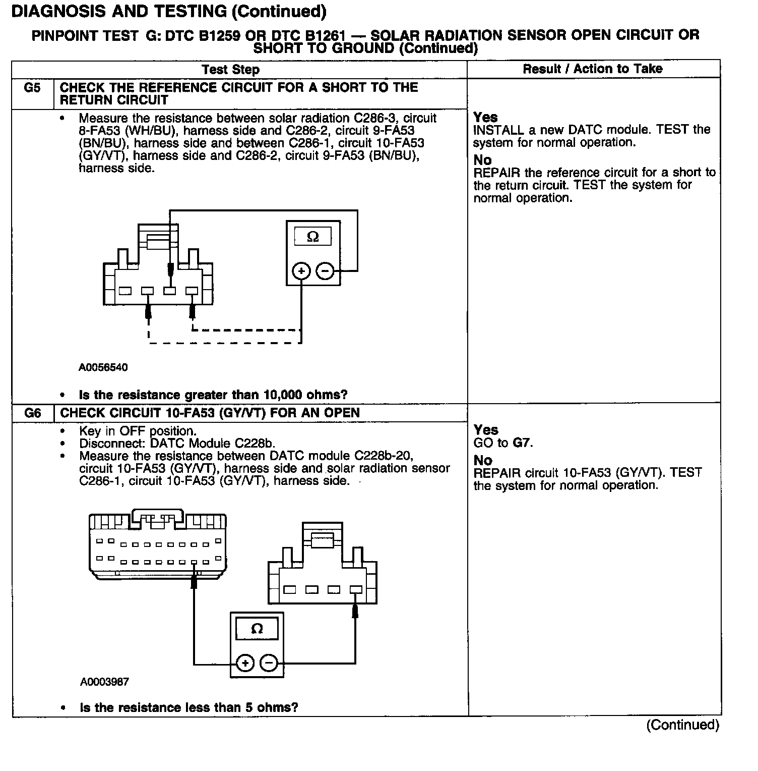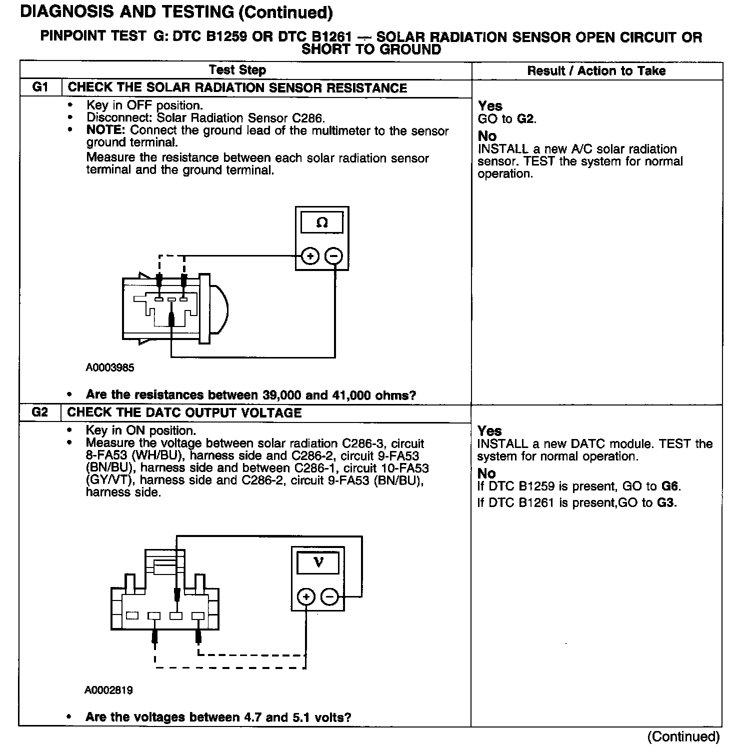 PINPOINT TEST G: DTC B1259 OR DTC B1261 - SOLAR RADIATION SENSOR OPEN CIRCUIT OR SHORT TO GROUNDTest G1-G2: