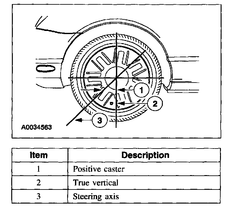 Caster is the deviation from vertical of an imaginary line drawn through the ball joints when viewed from the side. The caster specifications will give the vehicle the best directional stability characteristics when loaded and driven. The caster setting is not related to tire wear.