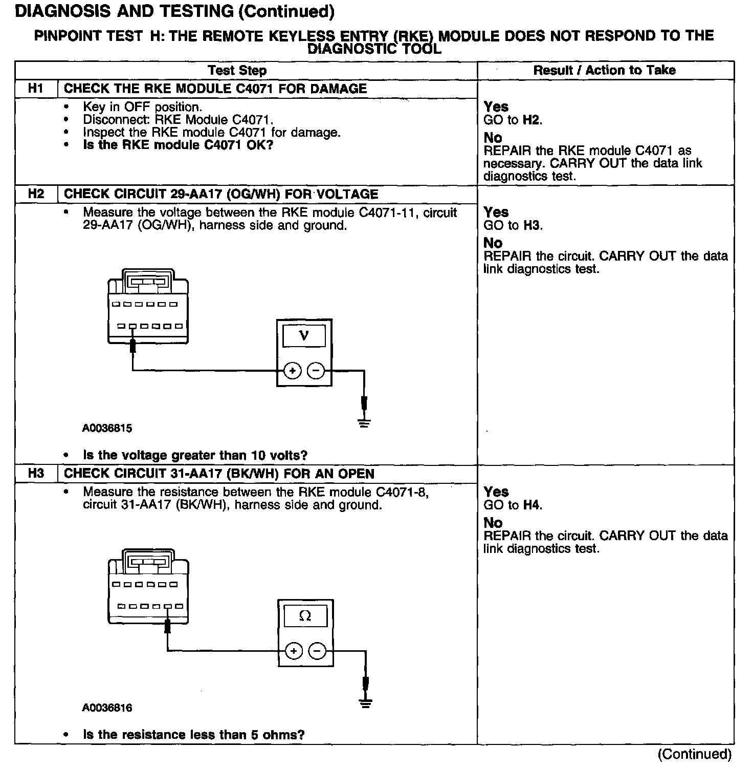 PINPOINT TEST H: THE REMOTE KEYLESS ENTRY (RKE) MODULE DOES NOT RESPOND TO THE DIAGNOSTIC TOOLTest H1-H3: