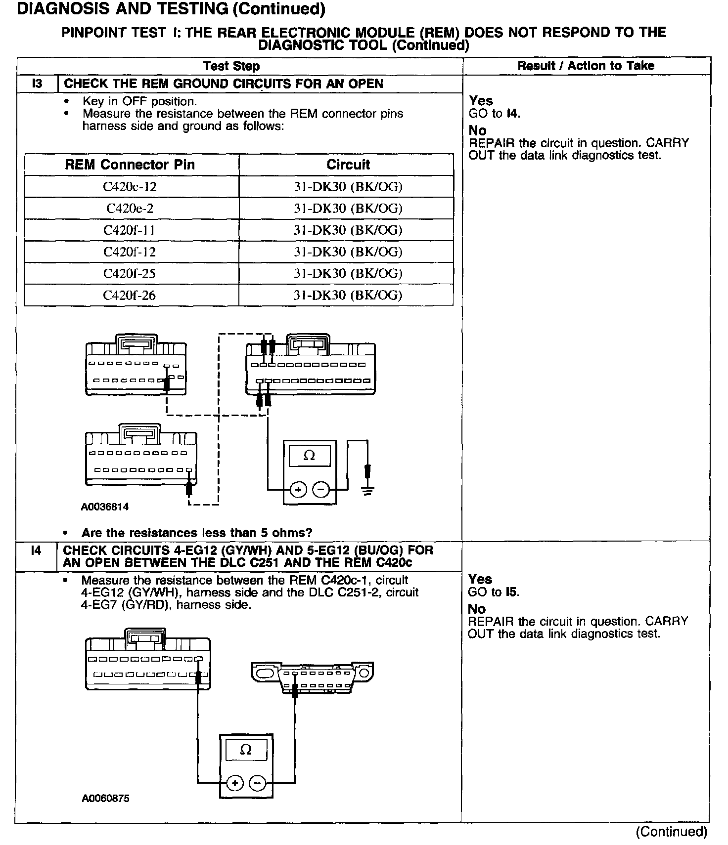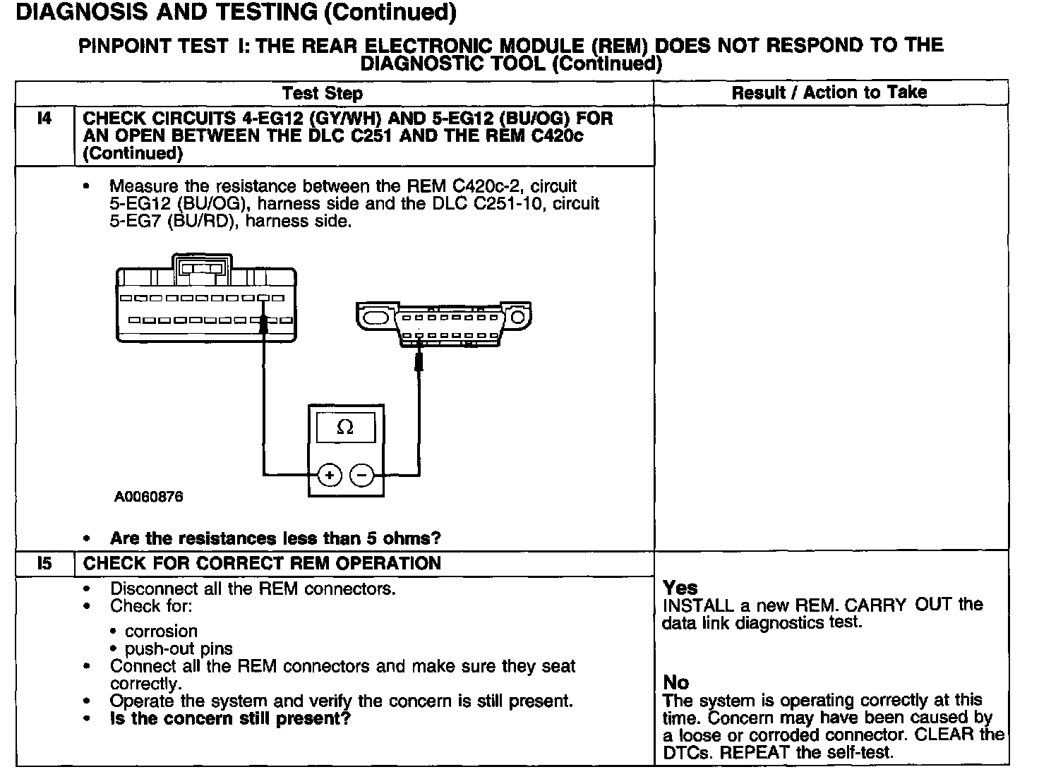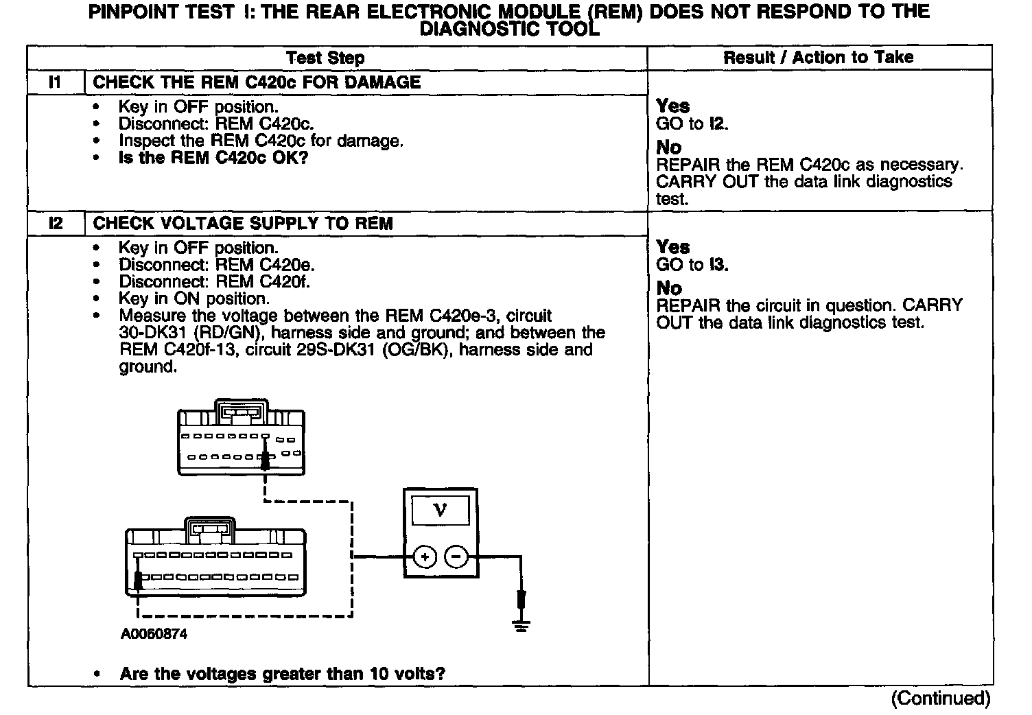 PINPOINT TEST I: THE REAR ELECTRONIC MODULE (REM) DOES NOT RESPOND TO THE DIAGNOSTIC TOOLTest I1-I2: