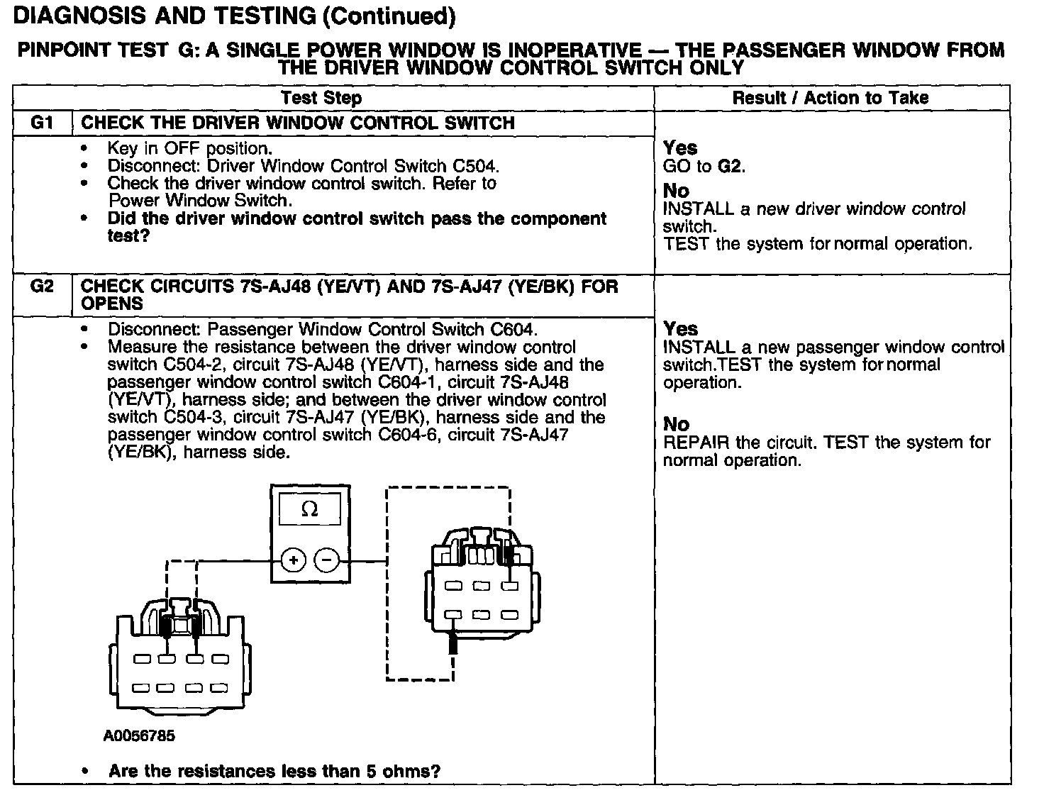 PINPOINT TEST G: A SINGLE POWER WINDOW IS INOPERATIVE - THE PASSENGER WINDOW FROM THE DRIVER WINDOW CONTROL SWITCH ONLYTest G1-G2: