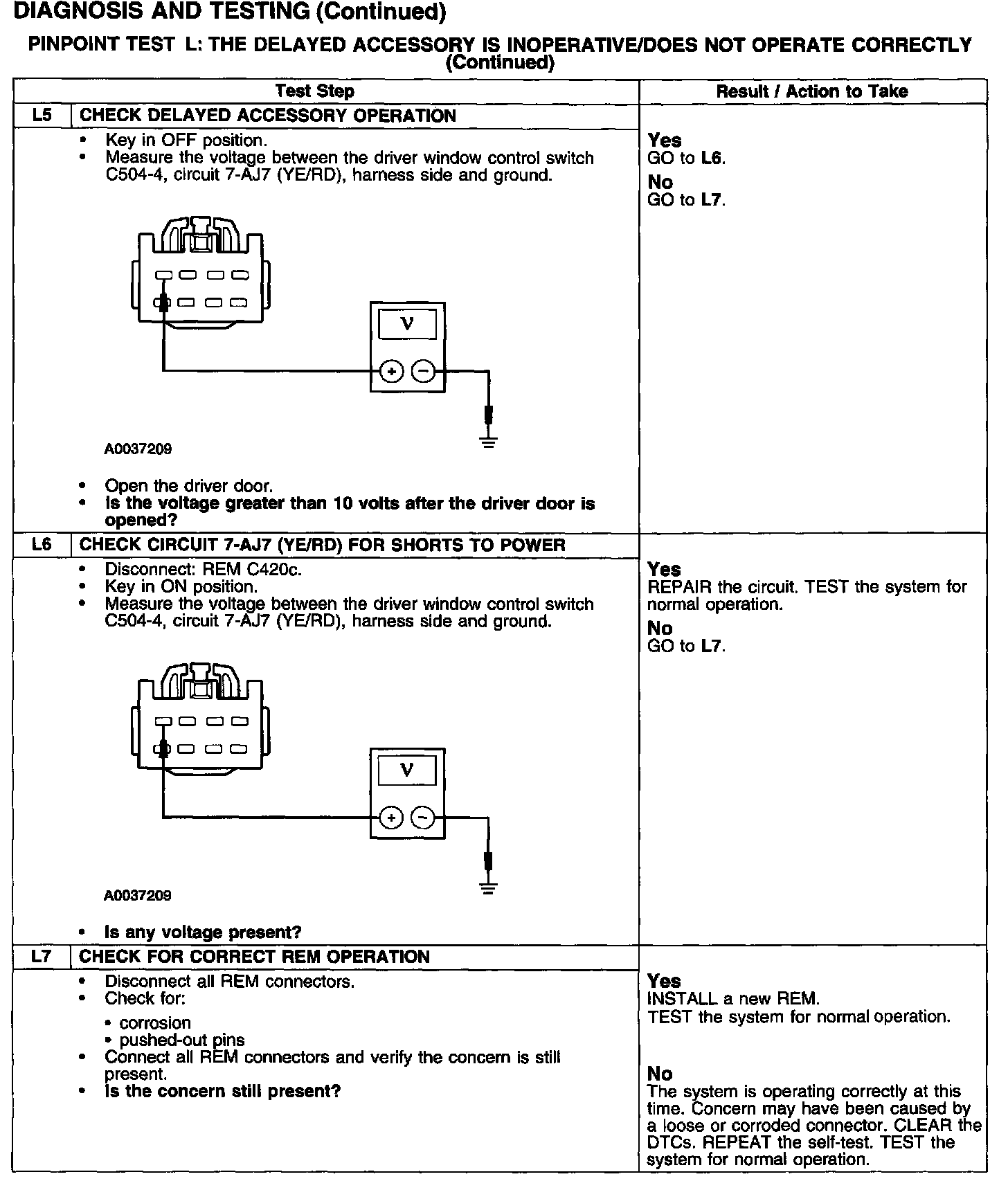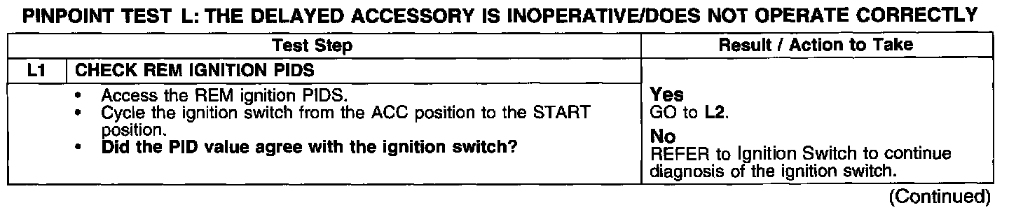 PINPOINT TEST L: THE DELAYED ACCESSORY IS INOPERATIVE/DOES NOT OPERATE CORRECTLYTest L1: