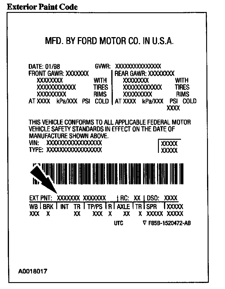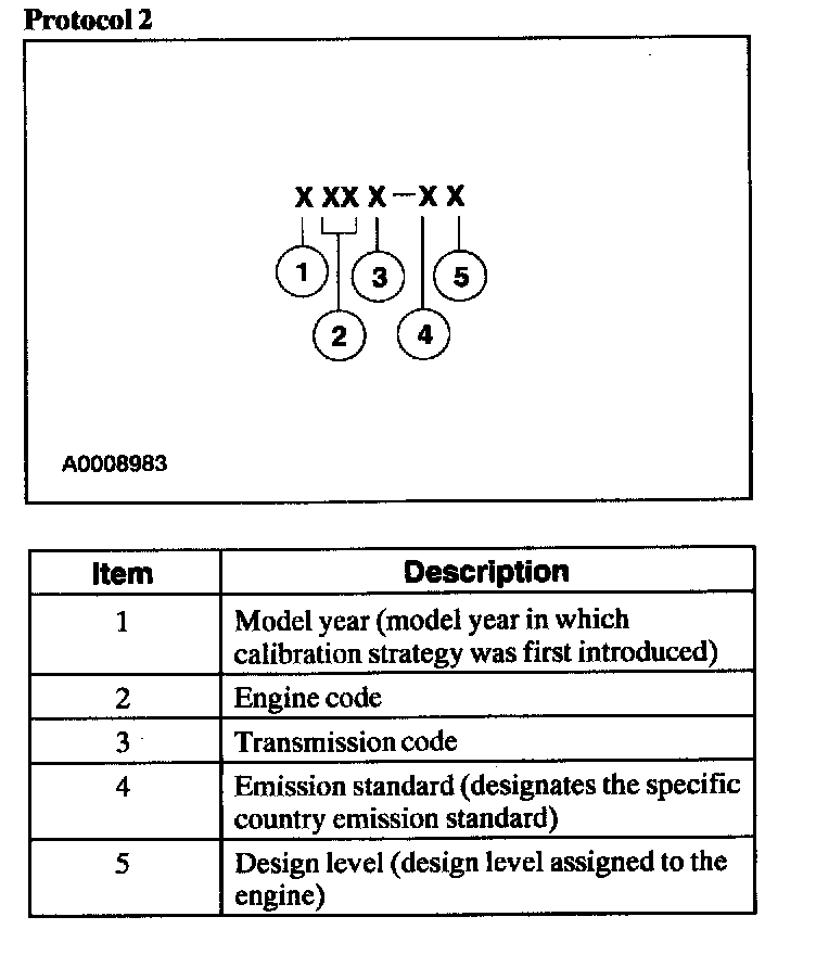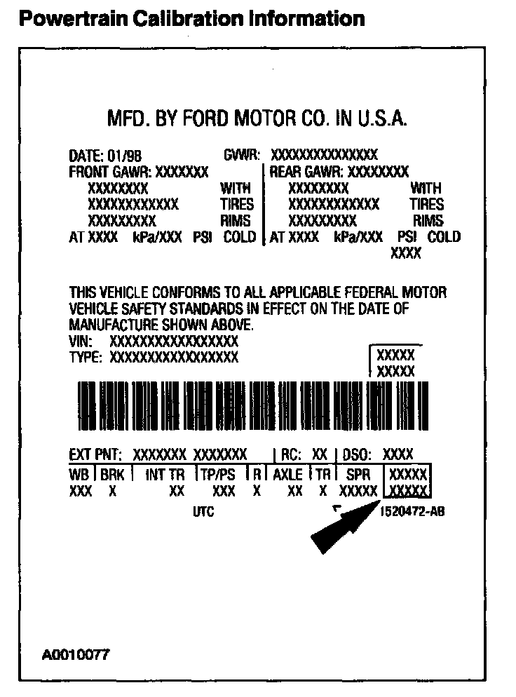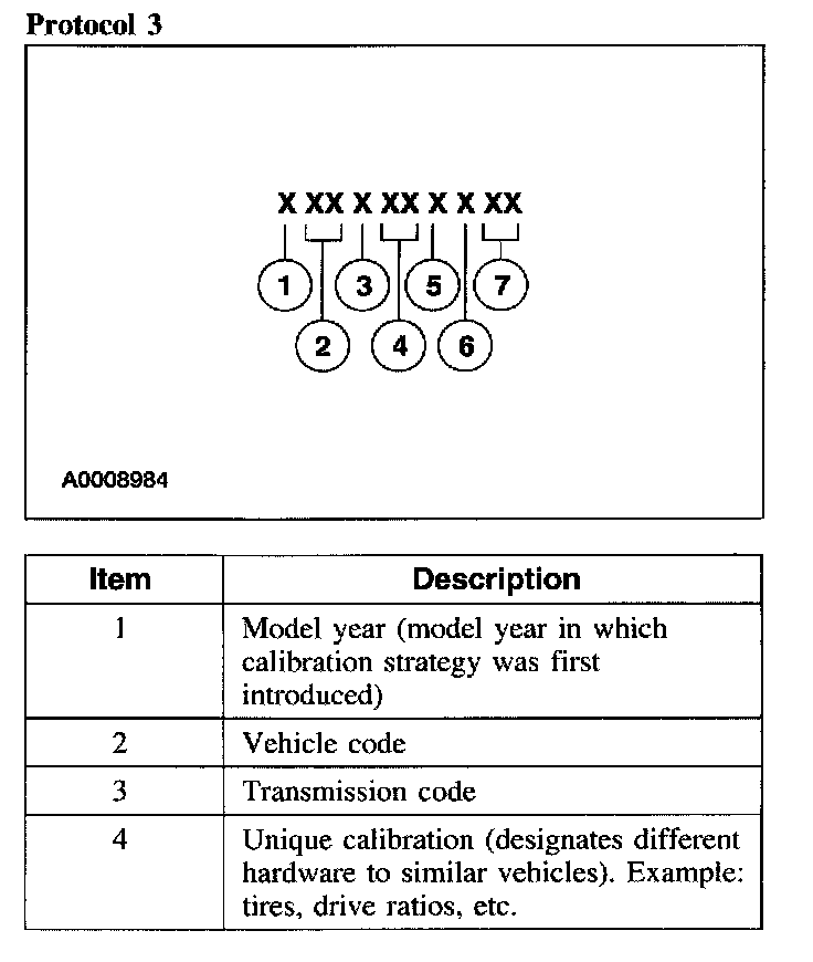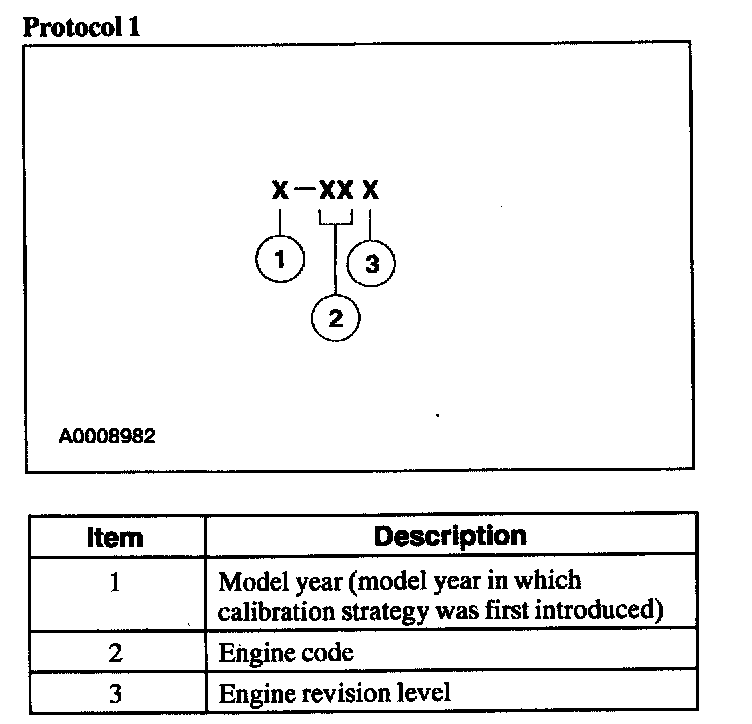 Powertrain calibration information is printed in the lower right corner of the vehicle certification label. Only the base calibration information is printed. Revision levels will not appear, however, they can be found in On Line Automotive Service Information System (OASIS). For the current model year, Ford Motor Company is using three different protocols which describe powertrain base calibration. These protocols are designed to provide worldwide standardization for vehicle calibration. If the electronic calibration strategy has been used since 1998 and carried into the current model year, Protocol 1 will be used. Refer to Protocol 1. If the electronic calibration strategy has been used since 1999 and is carried into the current model year, Protocol 2 will be used. Refer to Protocol 2. For electronic calibration strategies introduced in 2000 or later model years, Protocol 3 is used. Refer to Protocol 3.