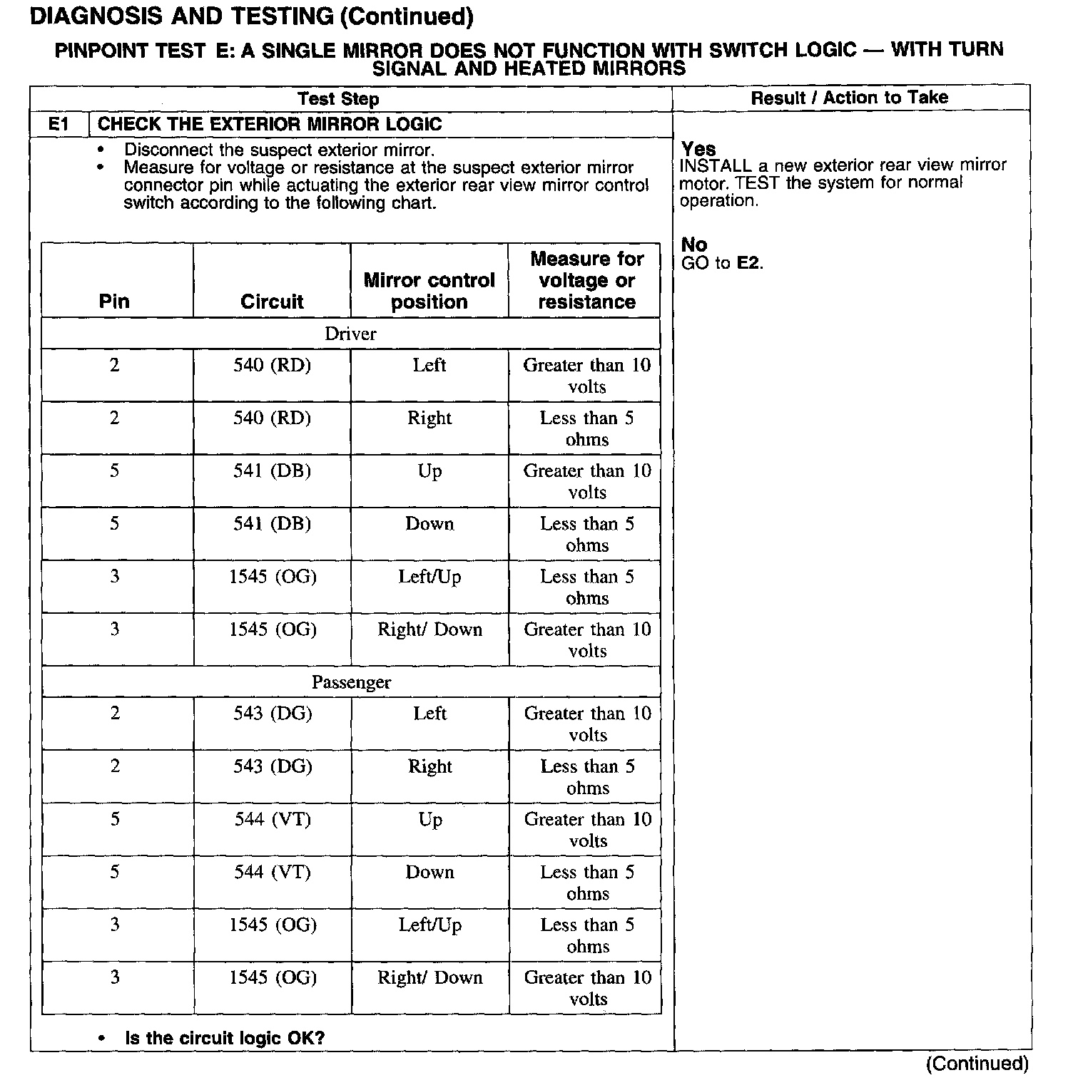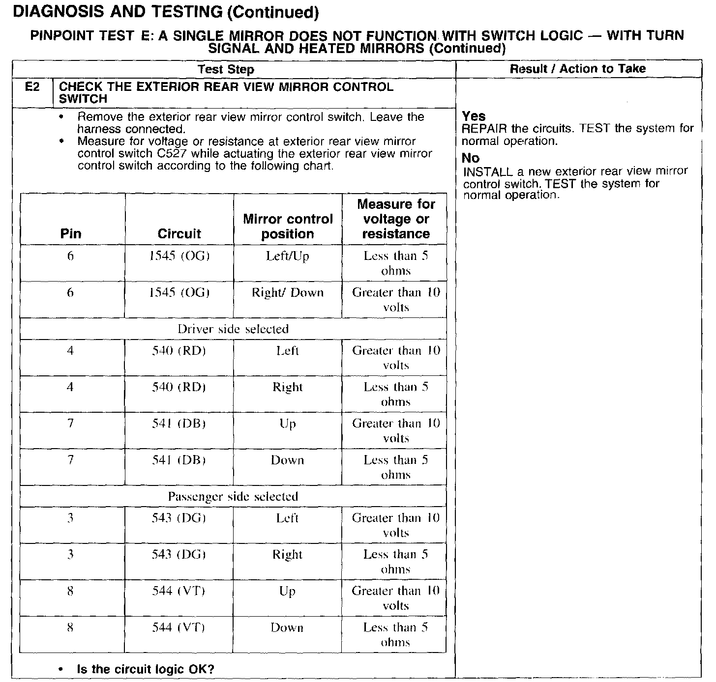 PINPOINT TEST E: A SINGLE MIRROR DOES NOT FUNCTION WITH SWITCH LOGIC - WITH TURN SIGNAL AND HEATED MIRRORS