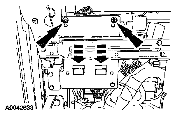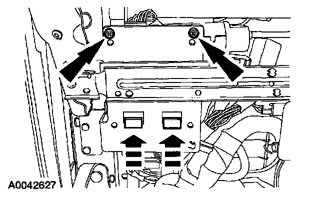 14. Slide the memory seat module on the bracket and install the two screws. Connect the electrical connectors to the memory seat module.
