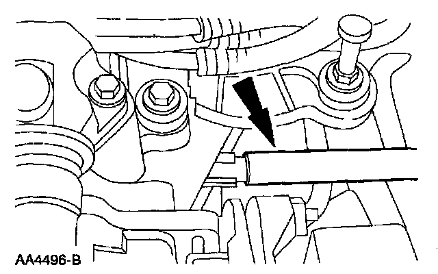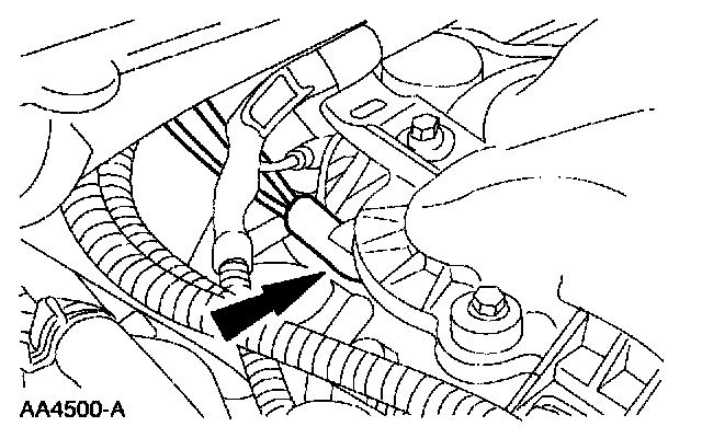 7. Remove the fuel tube retaining clip and the wire harness pin-type retainers.