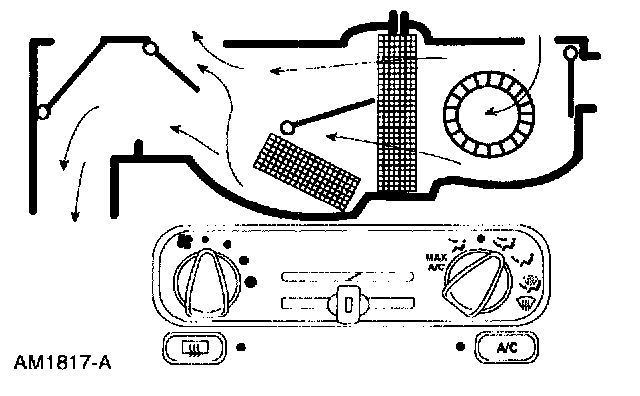 ^ The panel door and floor/defrost door vacuum control motors are at full vacuum, directing airflow to the instrument panel A/C registers. A small amount of airflow from the side window demisters will be present.