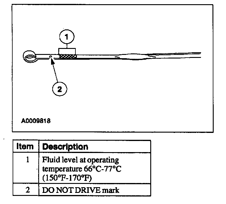 Check Fluid Level and ConditionCAUTION: The vehicle should not be driven if the fluid level indicator shows the fluid below the DO NOT DRIVE mark or internal failure could result.