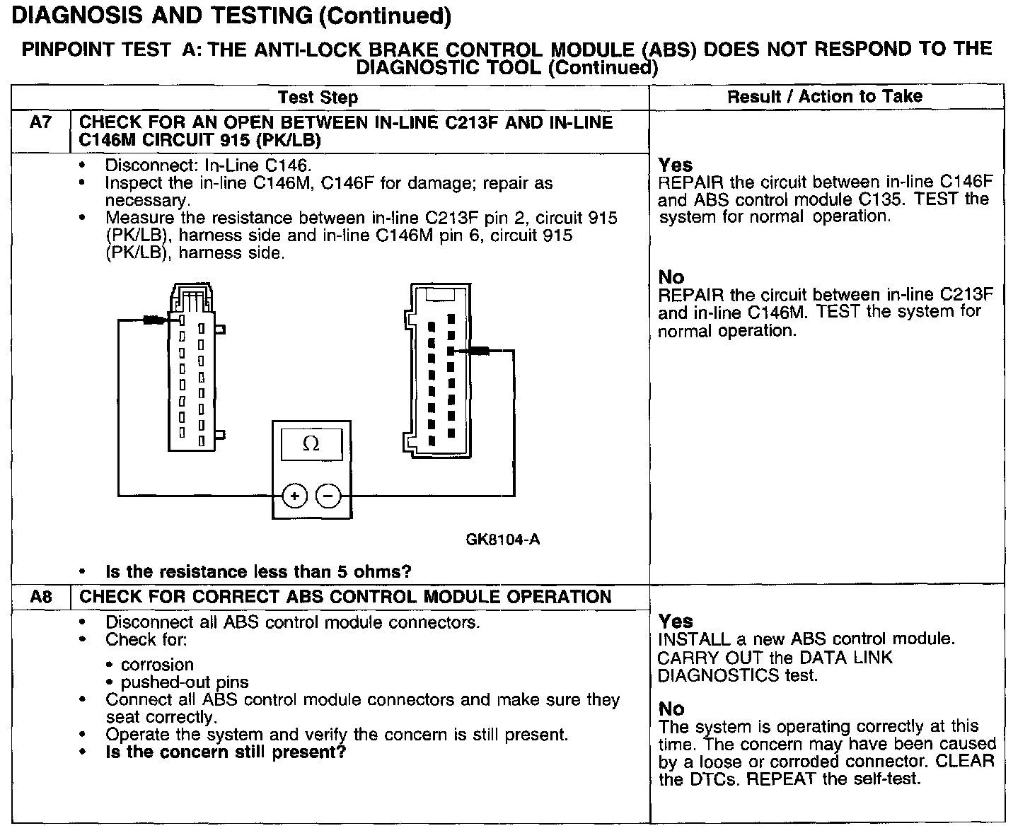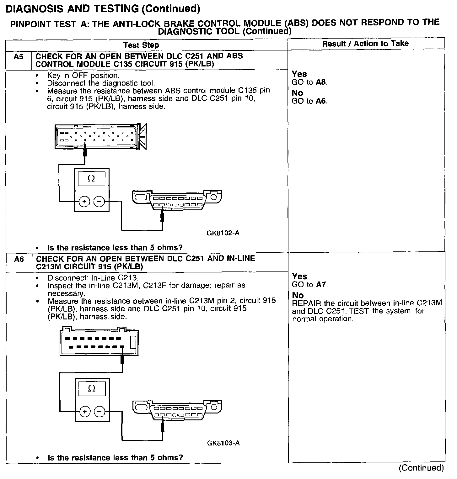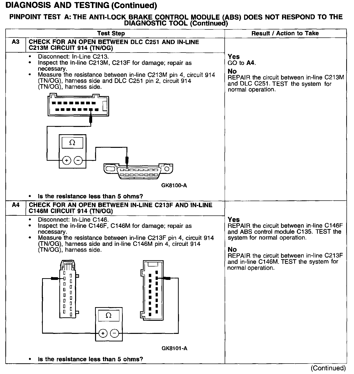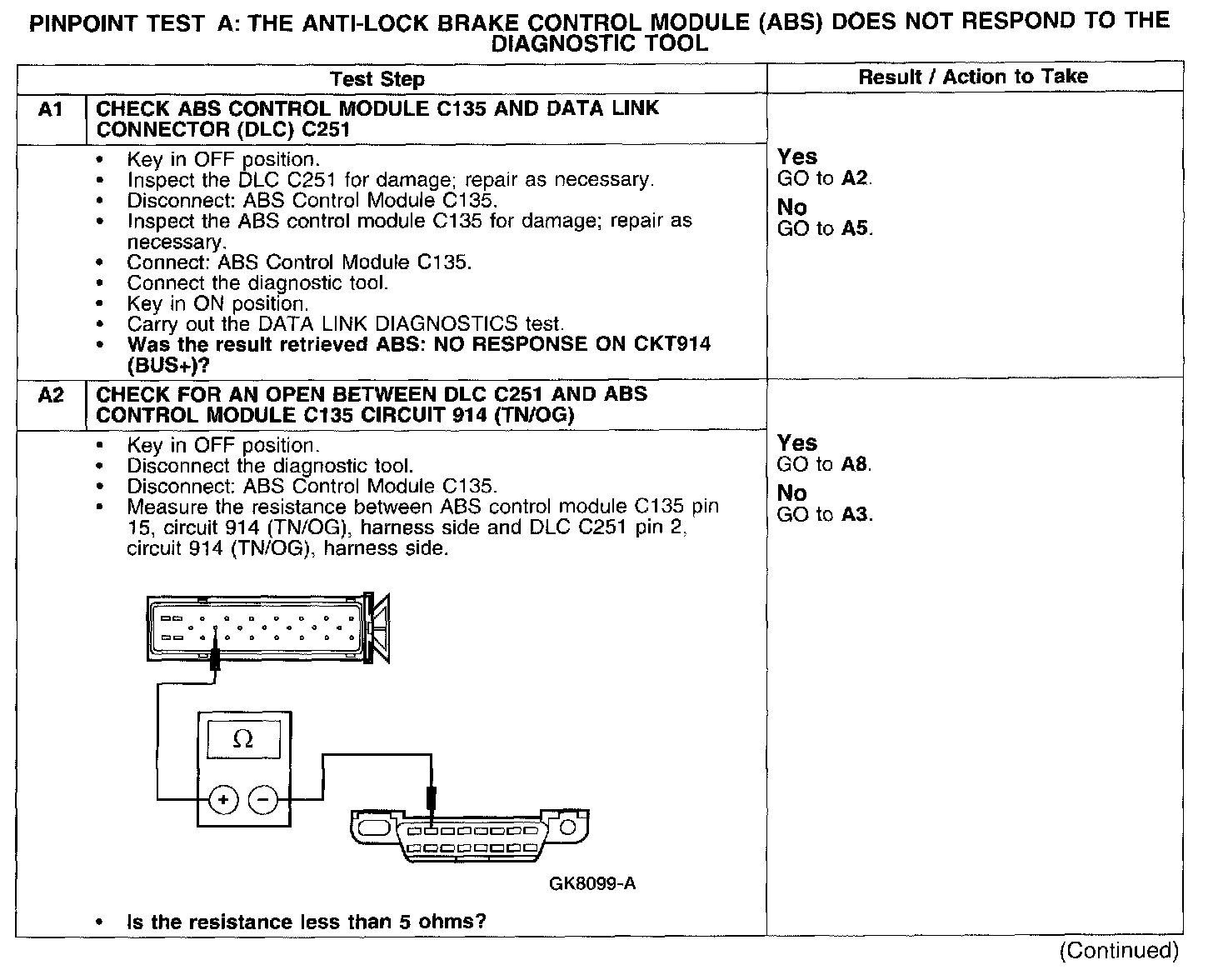 PINPOINT TEST A: THE ANTI-LOCK BRAKE CONTROL MODULE (ABS) DOES NOT RESPOND TO THE DIAGNOSTIC TOOL