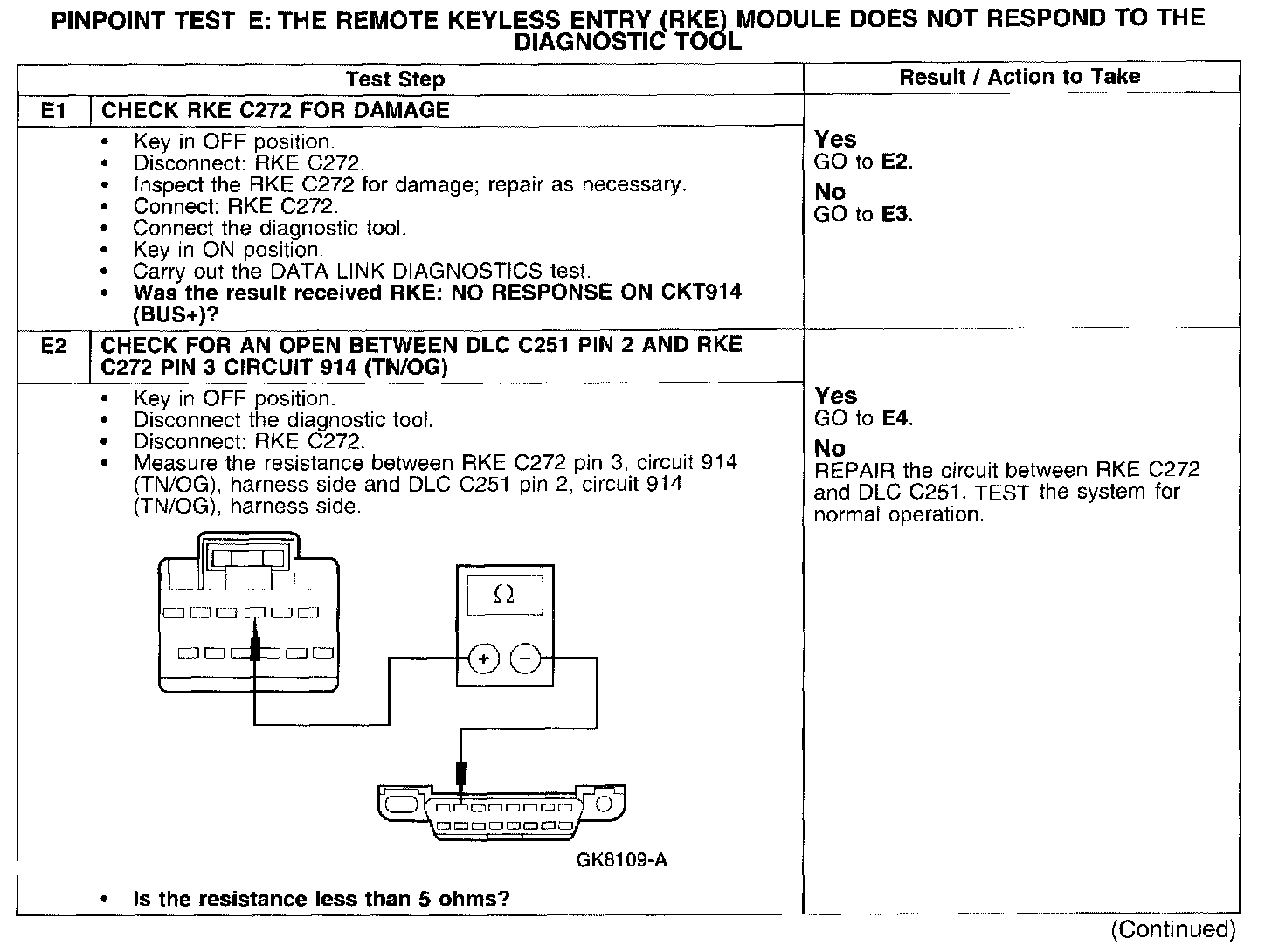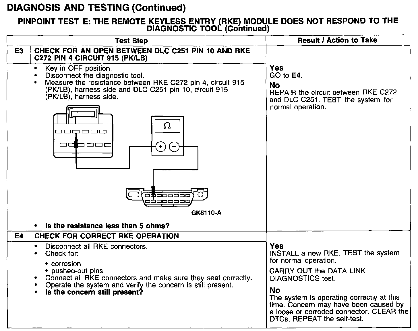PINPOINT TEST E: THE REMOTE KEYLESS ENTRY (RKE) MODULE DOES NOT RESPOND TO THE DIAGNOSTIC TOOL