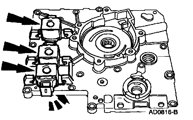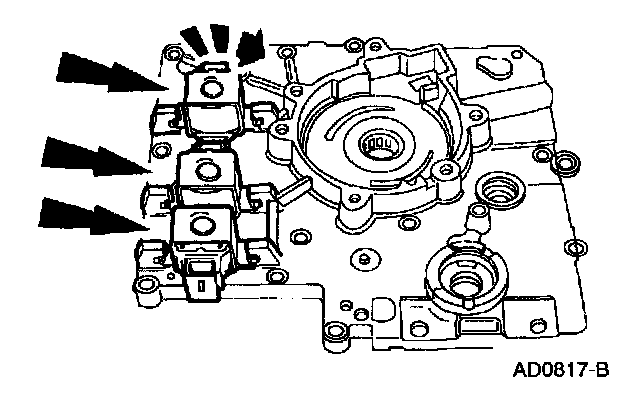 Install new 0-rings and install the shift solenoids by pressing down and rotating them until they lock in place.