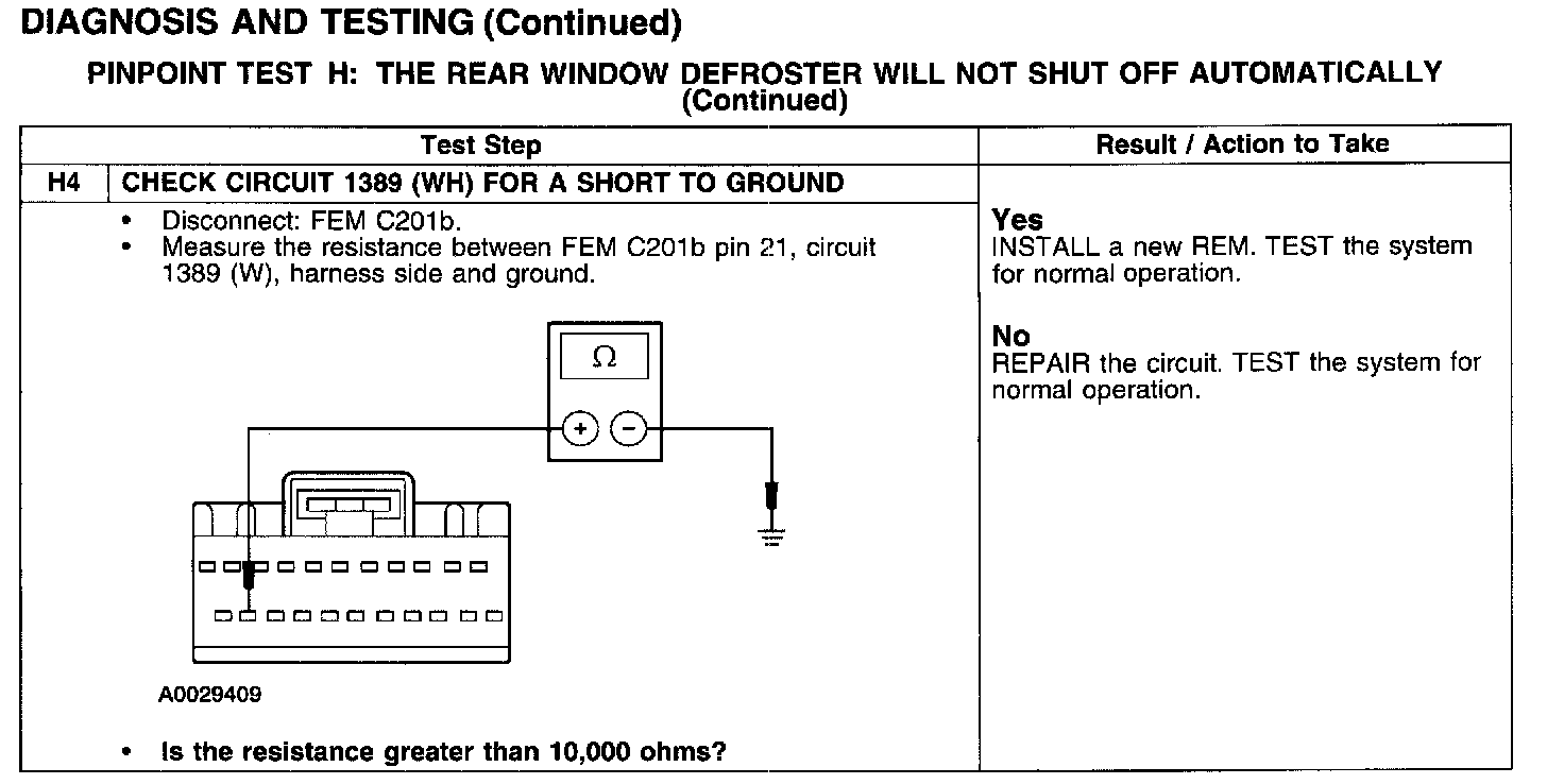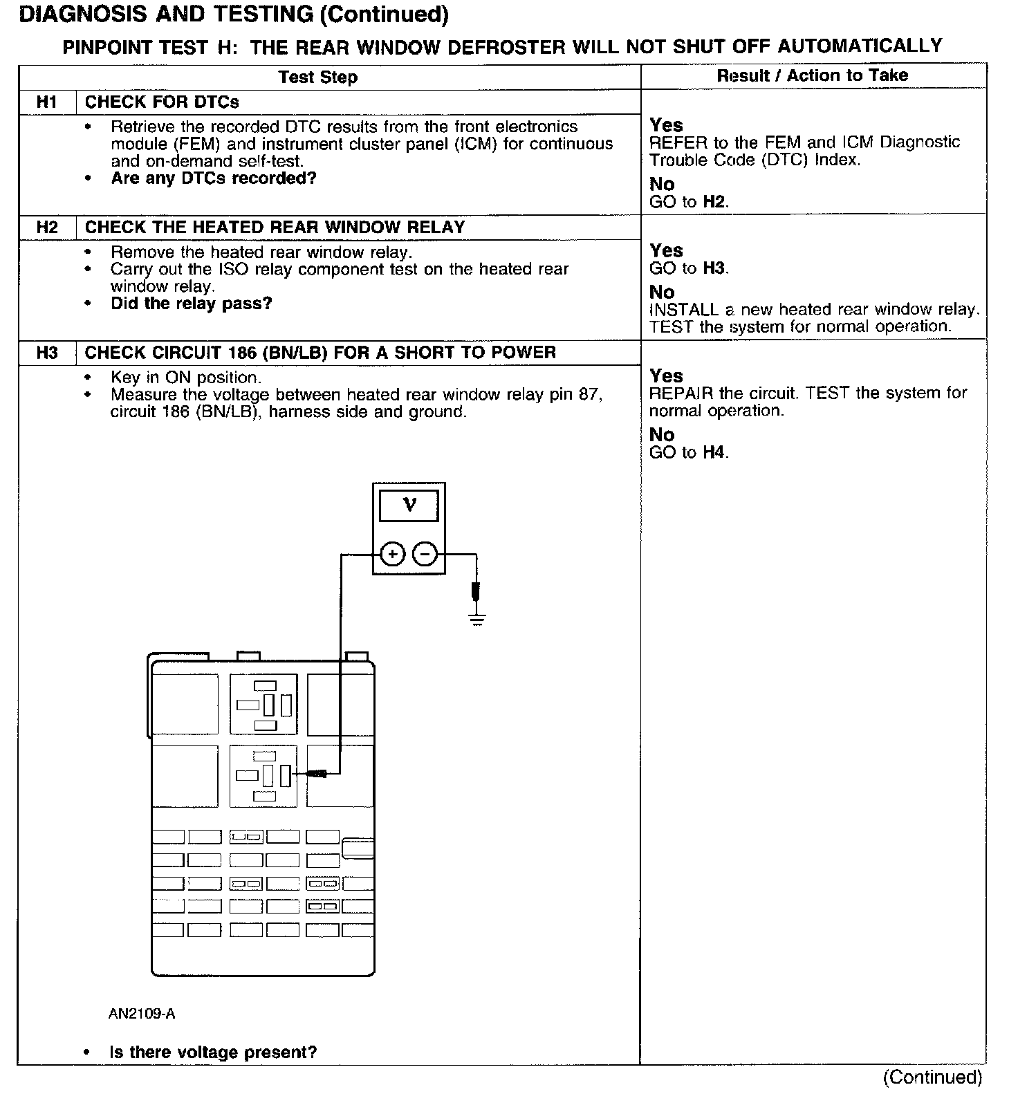 PINPOINT TEST H: THE REAR WINDOW DEFROSTER WILL NOT SHUT OFF AUTOMATICALLY