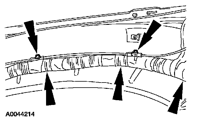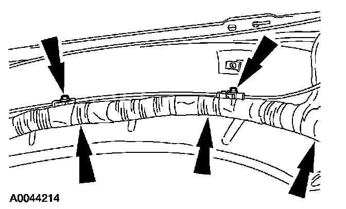 6. Release the wiring harness and the hood latch release cable locators.