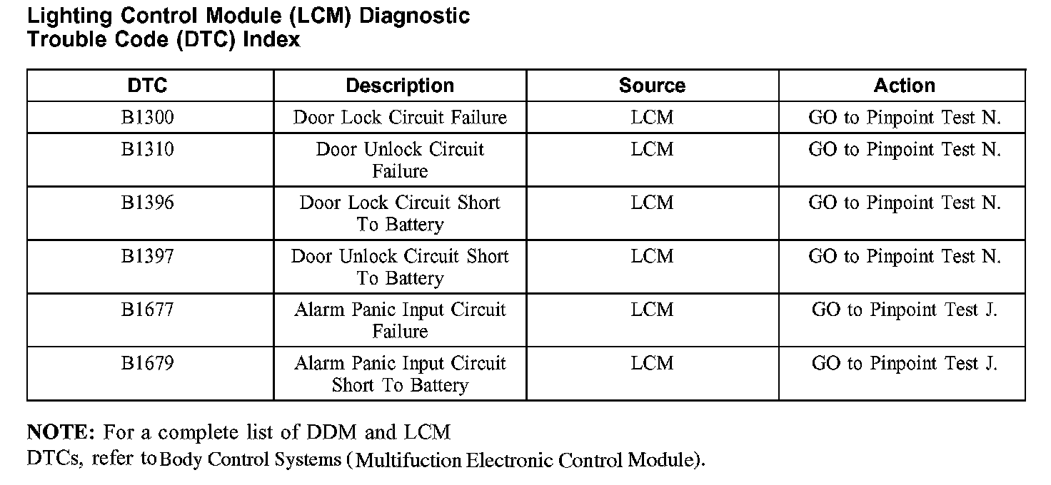 Lighting Control Module (LCM) Diagnostic Trouble Code Index