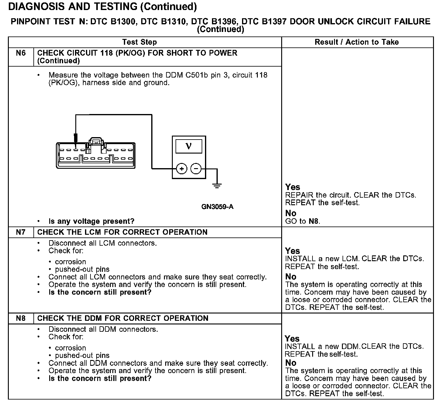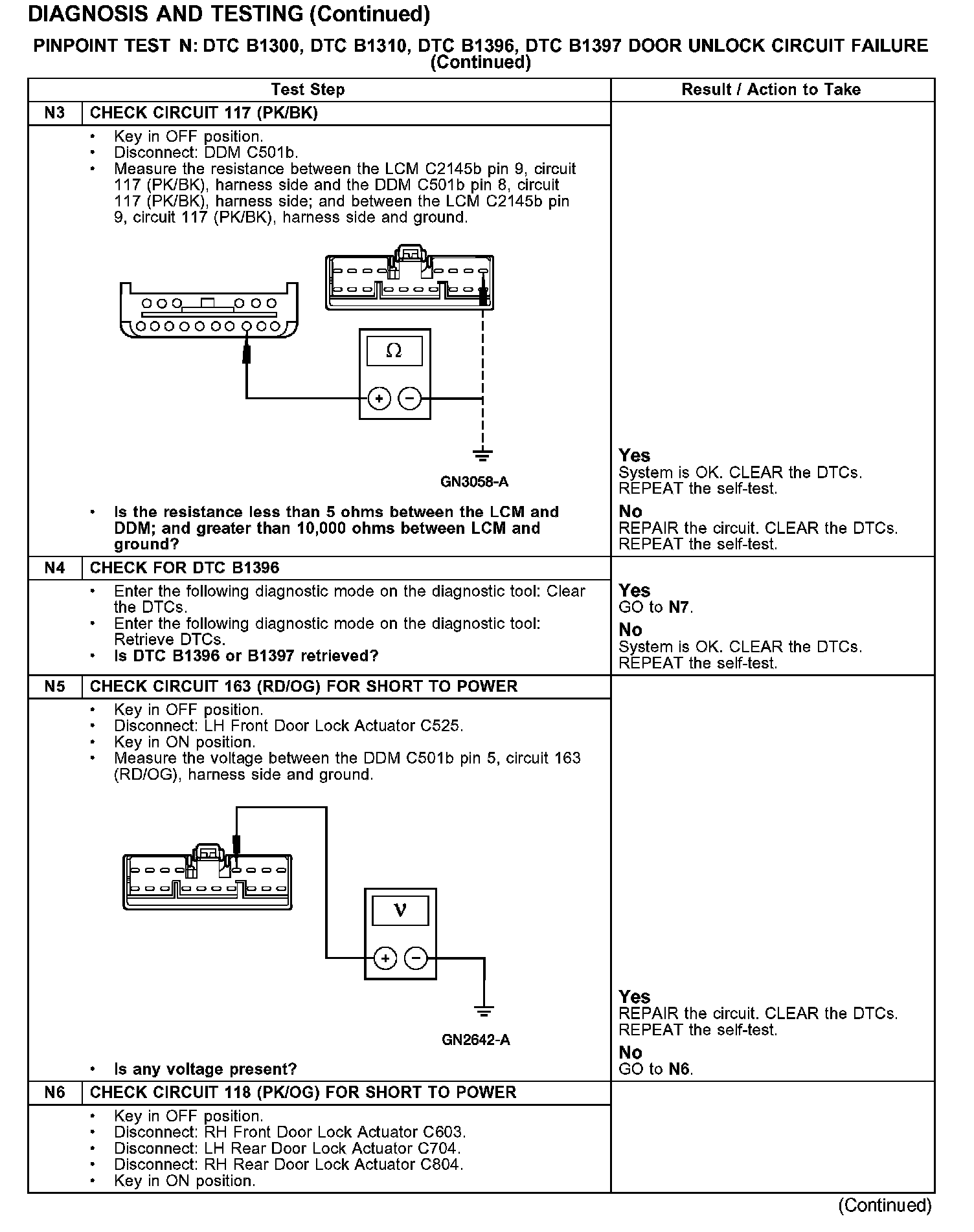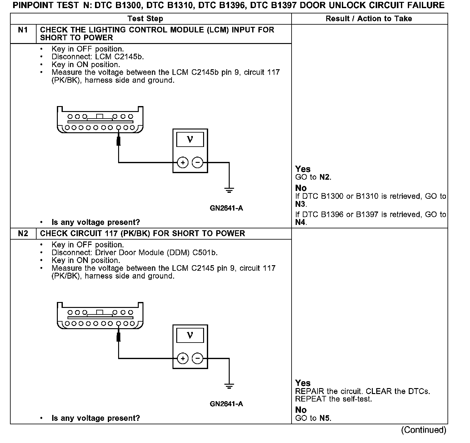 PINPOINT TEST N: DTC B1300, DTC B1310, DTC B1396, DTC B1397 DOOR UNLOCK CIRCUIT FAILURE