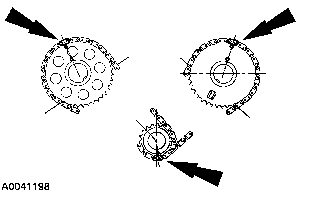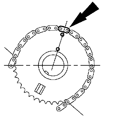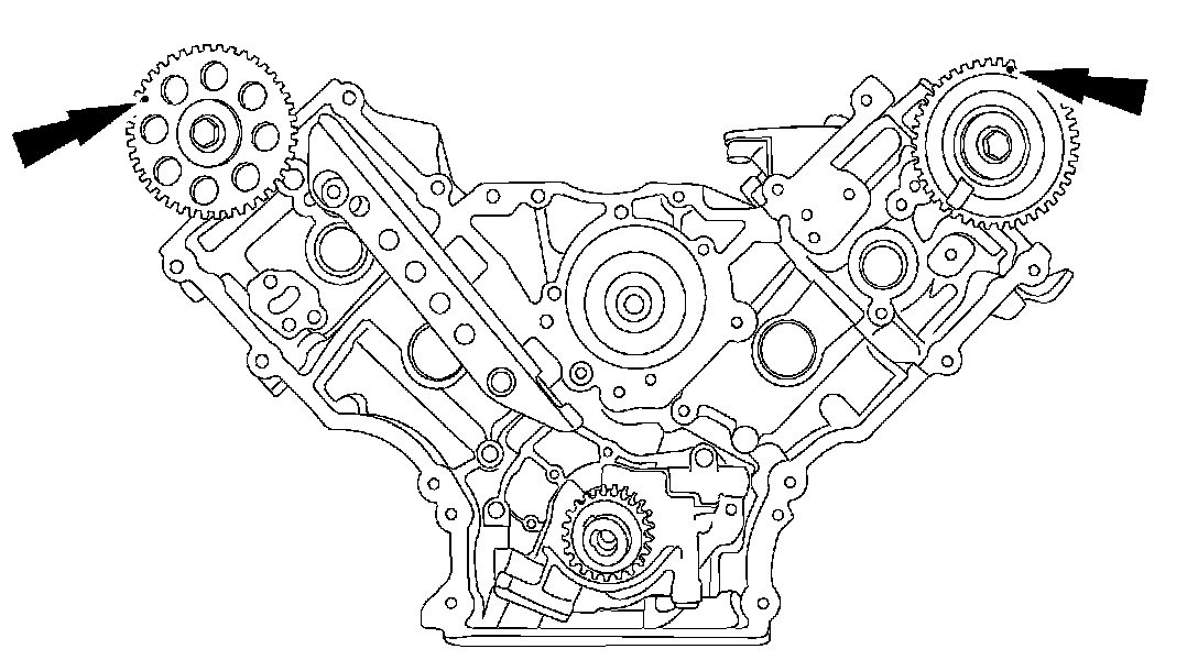 12. Rotate the RH camshaft sprocket until the timing mark is approximately at the 11 o'clock position. Rotate the LH camshaft sprocket until the timing mark is approximately at the 12 o'clock position.