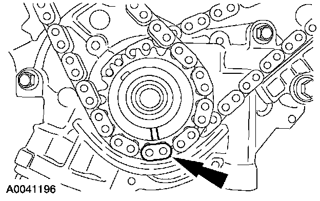 13. Position the LH (inner) timing chain on the crankshaft sprocket, aligning the copper (marked) link with the timing mark on the sprocket.