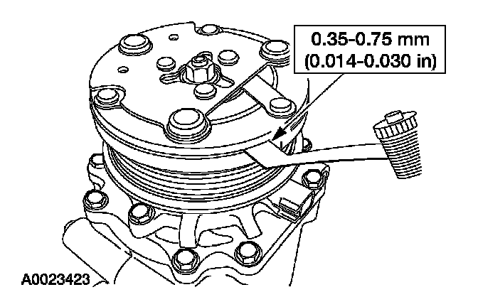 9. Measure and adjust (if necessary) the A/C clutch air gap by removing or adding A/C clutch plate spacers.