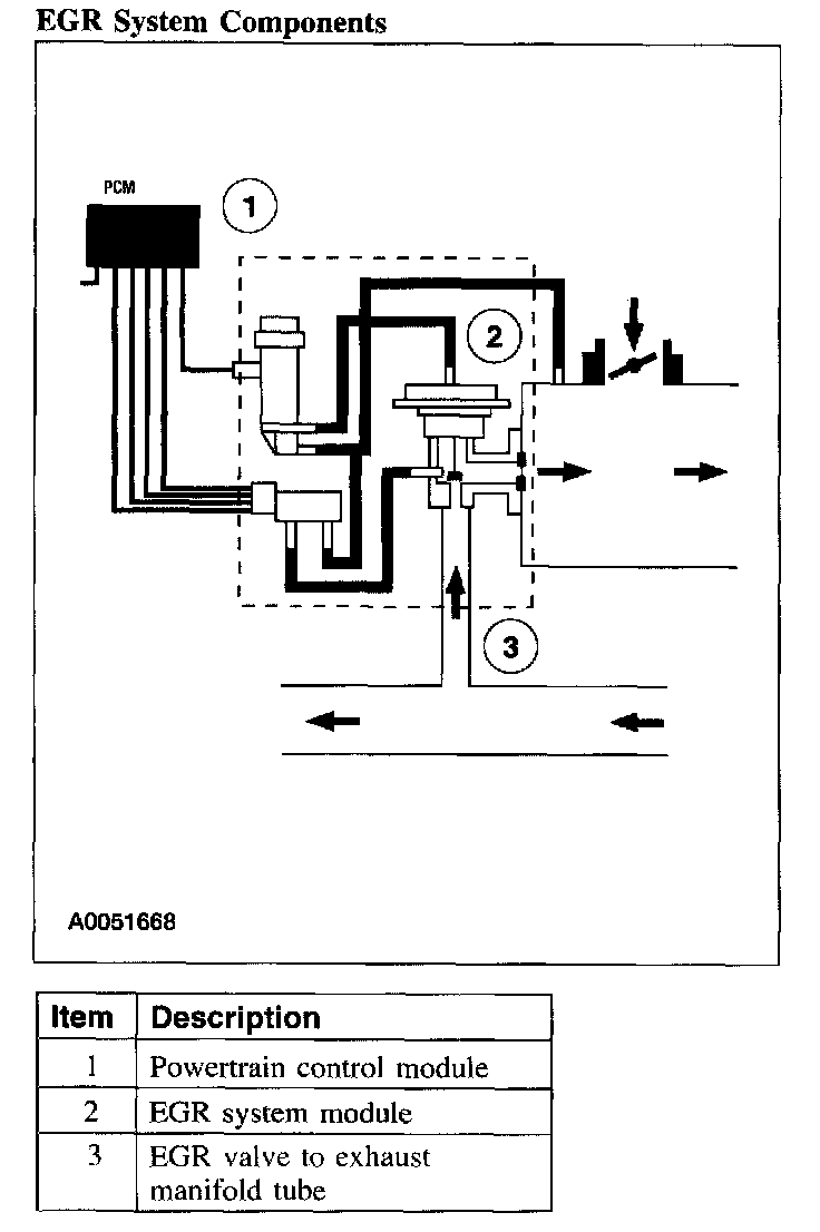 The powertrain control module (PCM) controls the EGR vacuum regulator solenoid. The EGR vacuum regulator solenoid controls the vacuum to the EGR valve. When the EGR valve opens, exhaust gas flows to the intake manifold. The EGR transducer measures the flow through the EGR valve to exhaust manifold tube and sends a signal to the powertrain control module.