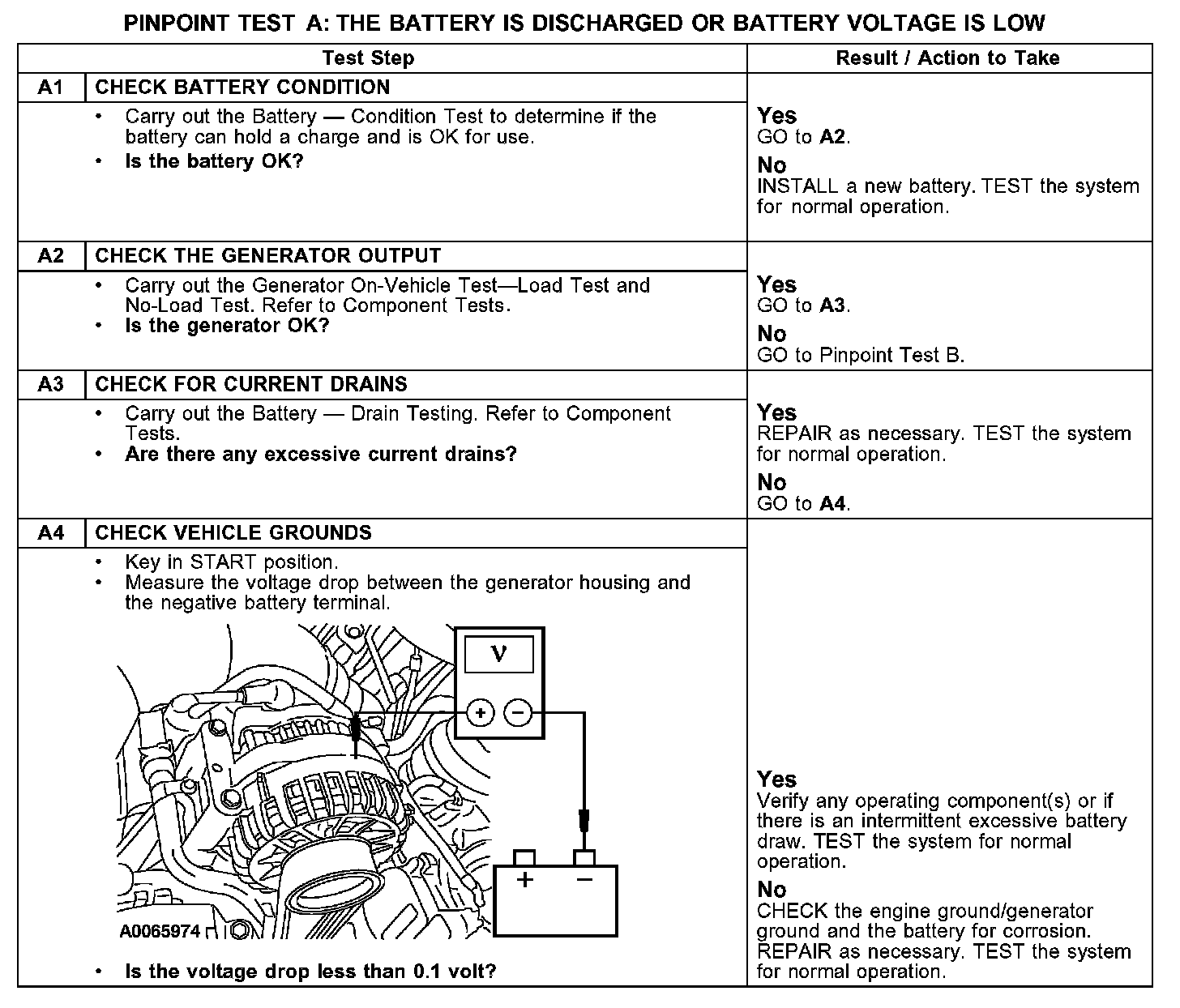 PINPOINT TEST A: THE BATTERY IS DISCHARGED OR BATTERY VOLTAGE IS LOW