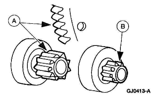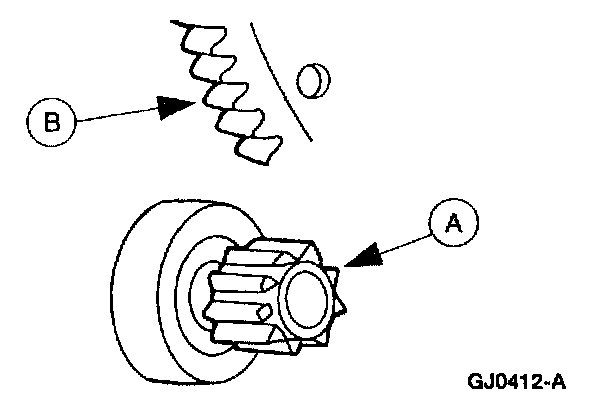 3. If the (A) starter drive gear and the flywheel ring gear are not fully meshing or the gears are (B) milled or damaged, replace the starter motor. Replace the flywheel ring gear.