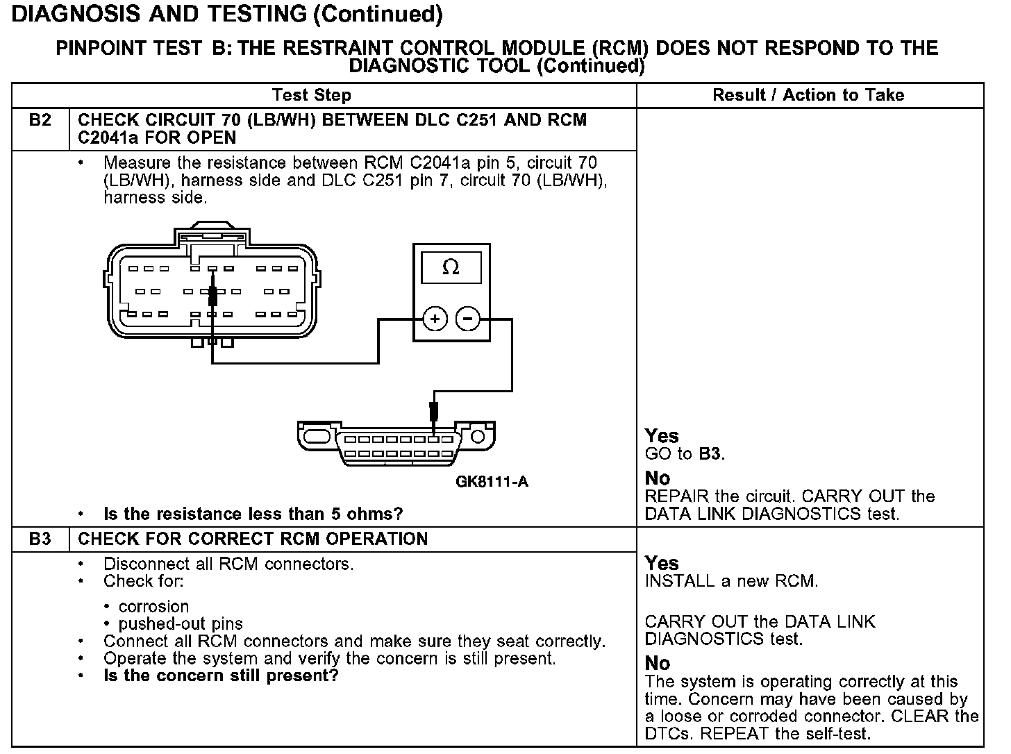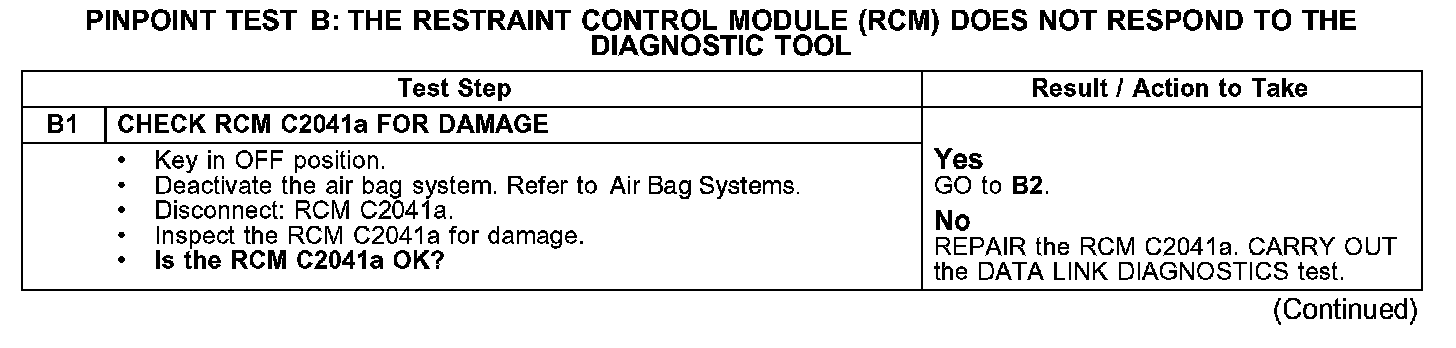 PINPOINT TEST B: THE RESTRAINT CONTROL MODULE (RCM) DOES NOT RESPOND TO THE DIAGNOSTIC TOOL
