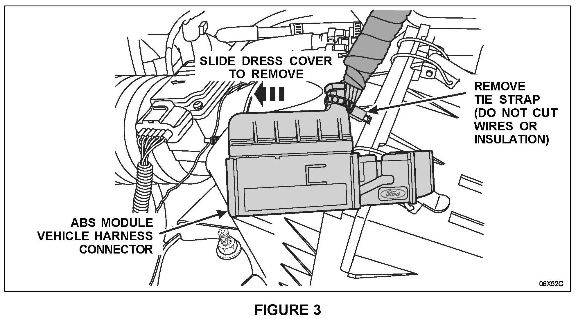 1. Reinstall the dress cover and use electrical tape to secure the cover at the same location where the original tie strap was removed. Apply Motorcraft Electrical Grease XG-1 2 to the ABS module connector, position and connect the harness as follows: