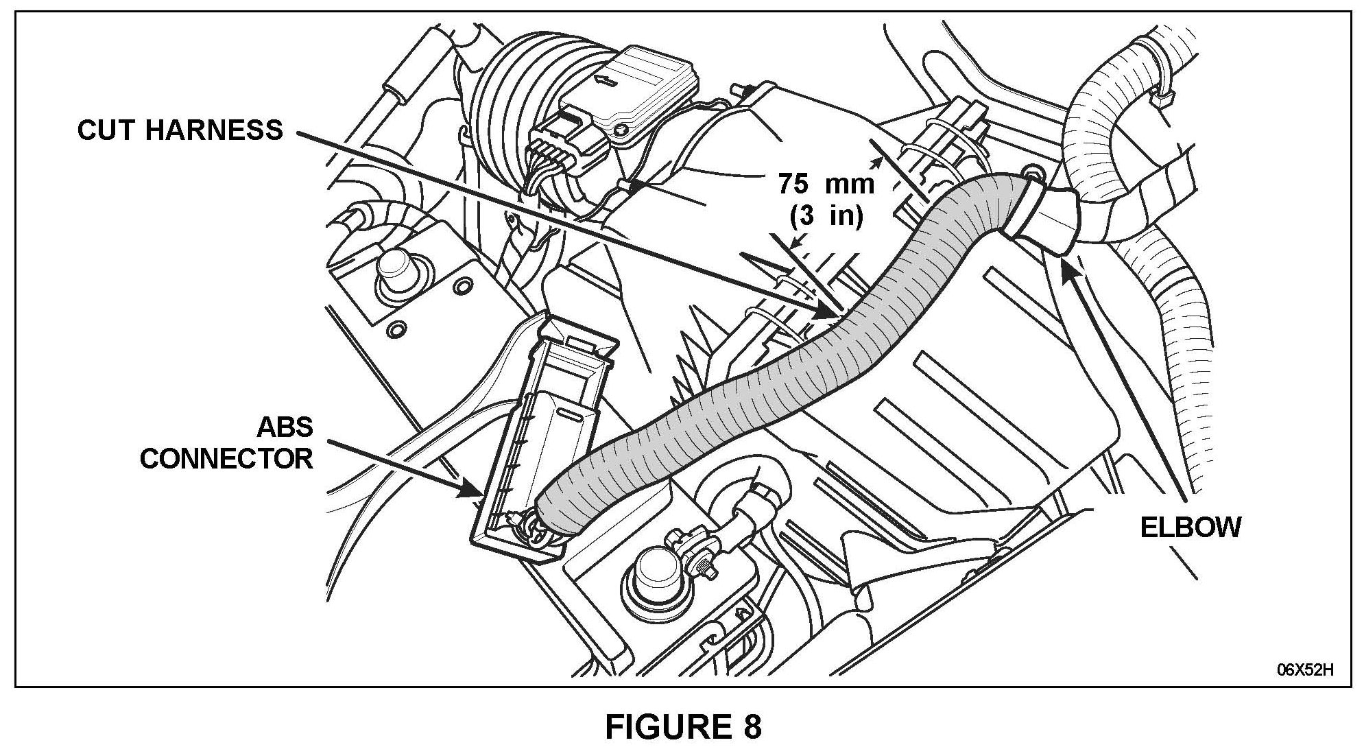 2. Measure approximately 75 mm (3 in) from the end of the elbow towards the ABS module connector, then, using suitable wire cutters, cut the harness (all wires) to the same length. See Figure 8.