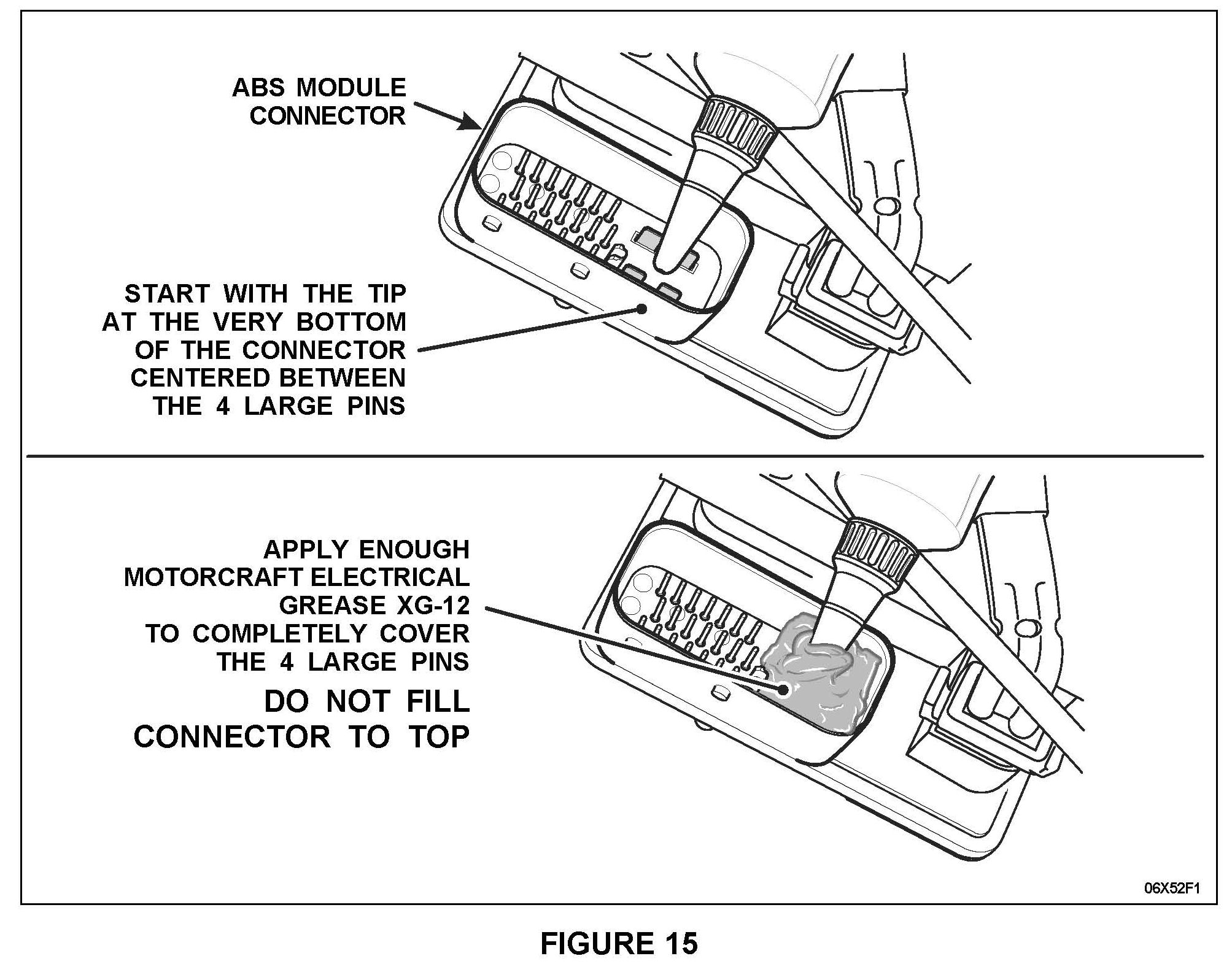 - With the tip of the applicator tube snipped off, position the end of the tip between the 4 large flat pins at the bottom of the ABS module connector. Squeeze out enough grease to completely cover the 4 flat pins. See Figure 15. DO NOT spread the grease around the connector. Applying an excess amount of grease into the connector cavity will cause a hydro lock" condition in which the connector will not be able to be seated fully or locked in place.