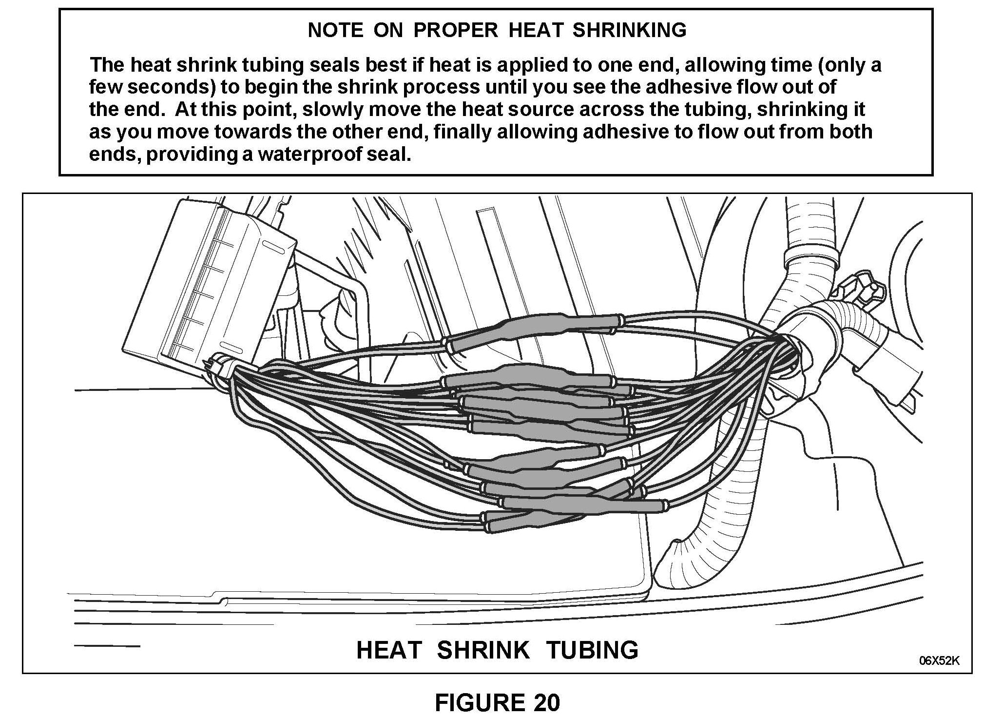6. After soldering the wires, center each piece of heat shrink tubing over the splice. Then, using the flameless heat gun provided in the Rotunda Kit, shrink one piece of tubing at a time until the adhesive flows out of both ends. Continue until all wires are insulated. See Figure 20.