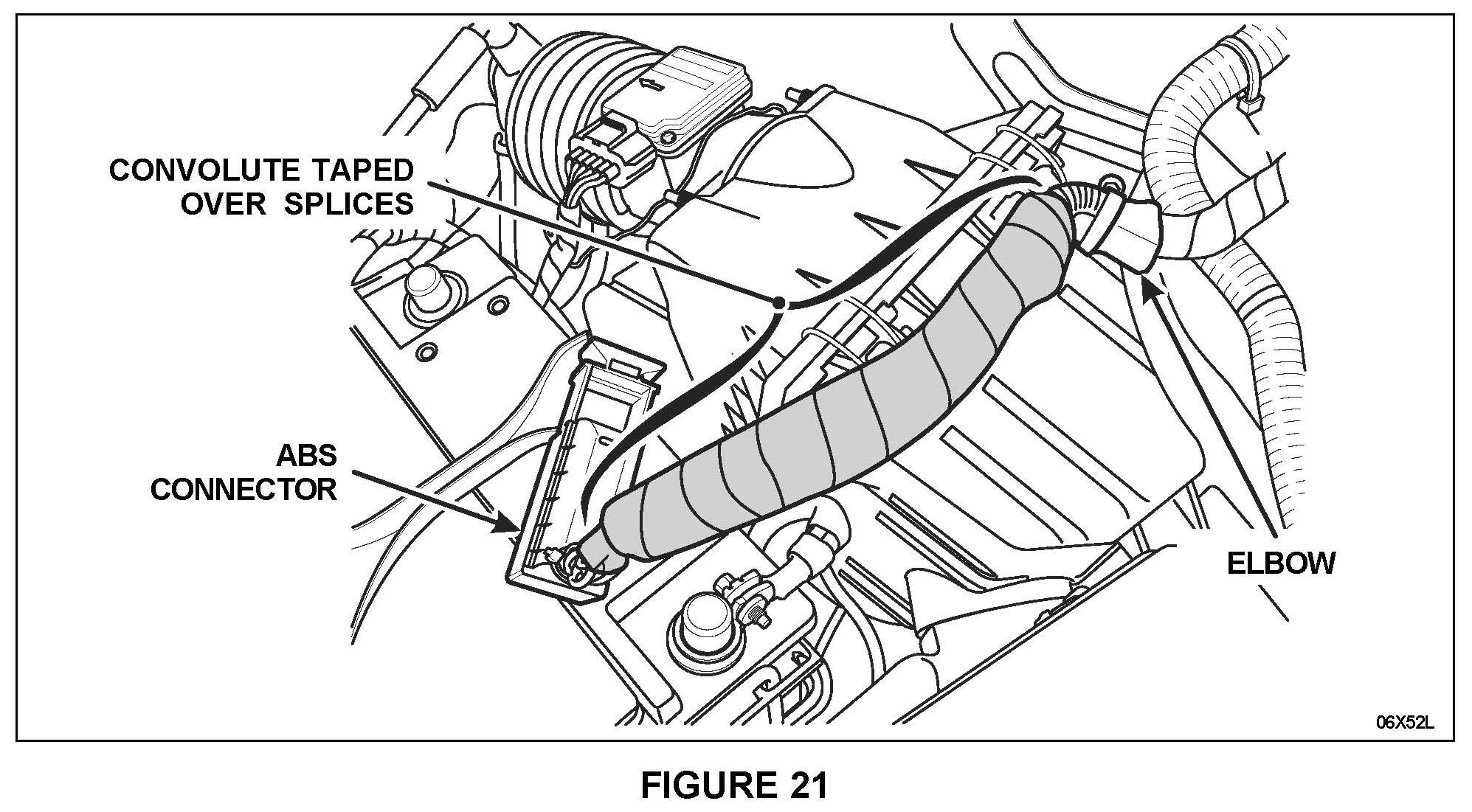 7. Install the supplied convolute tubing over the spliced area and secure with electrical tape. Apply tape to the entire length of the convolute and be sure to secure the convolute to the elbow at one end, and as close as possible to the ABS connector on the other. See Figure 21.